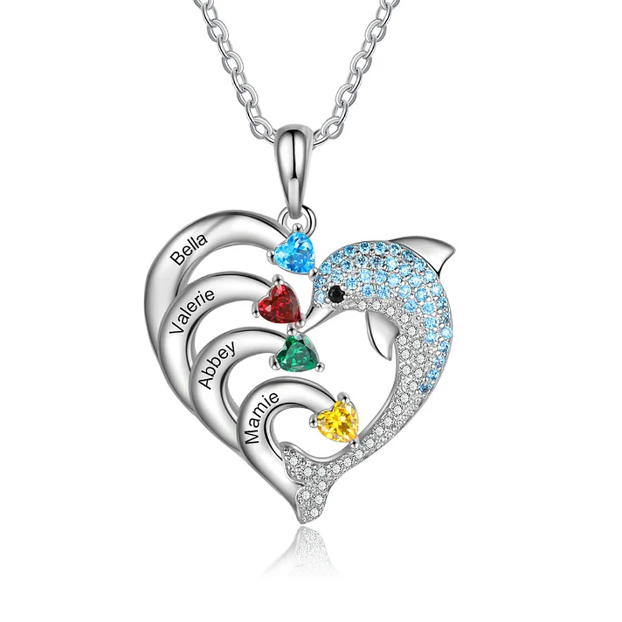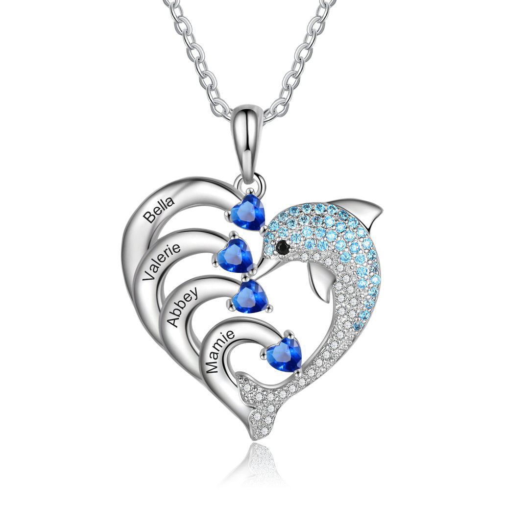 September Birthday Gift Personalised Heart Dolphin Necklace With 4 Birthstones Engraved Names Gift For Her