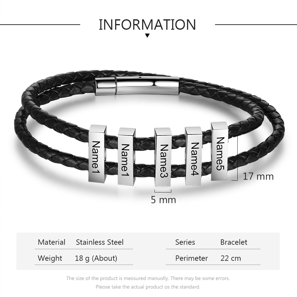 Personalised 3 Layer Leather Bracelet with 5 Beads Engraved Names Men's Bracelets for Him