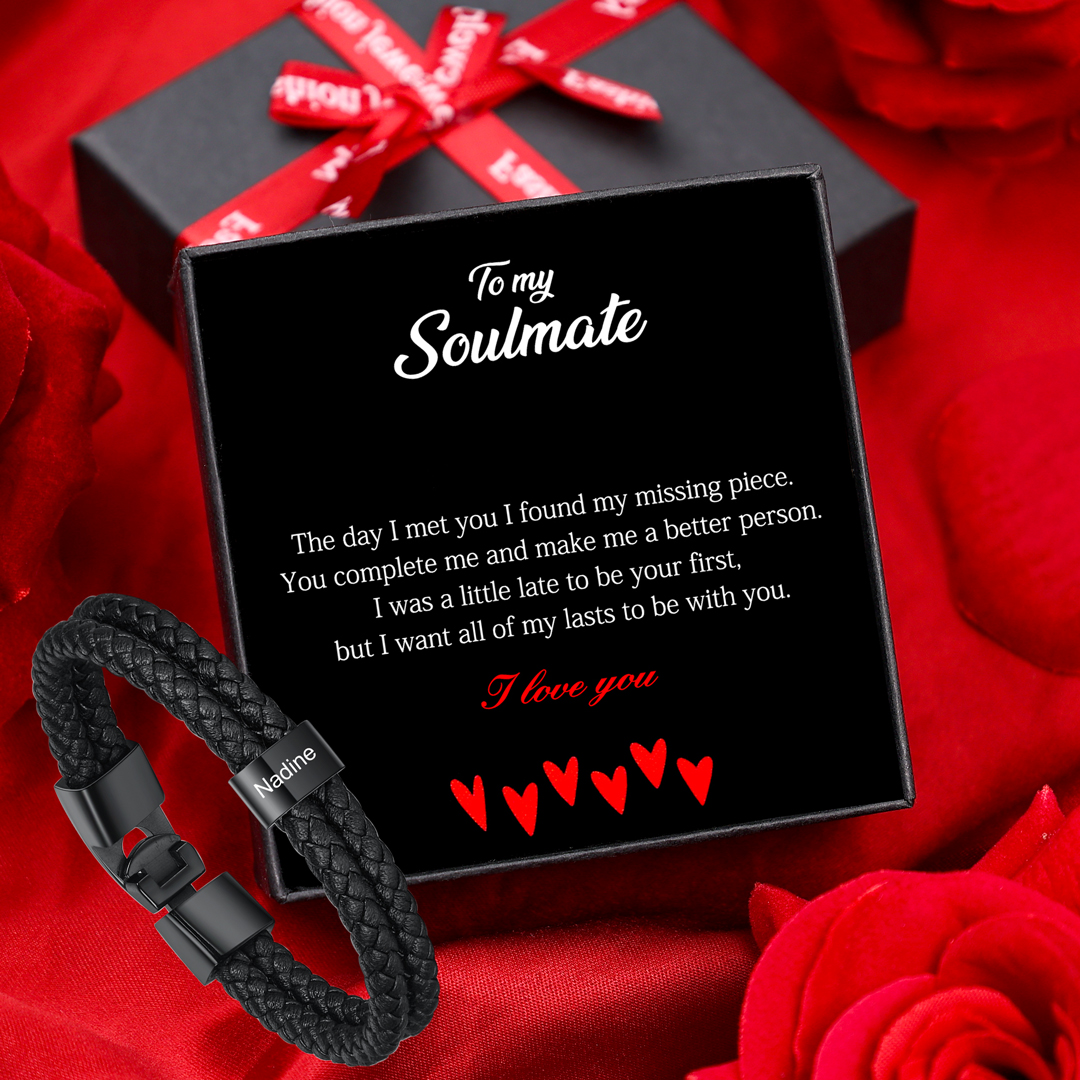 1 Name-Personalised Braided Leather Bracelet Set With Gift Box-Custom Men's Bracelet Engraved 1 Name for Him