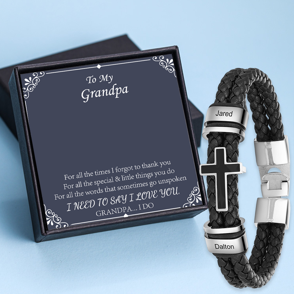 2 Names-Personalised To My Grandpa Cross Bracelet Set With Gift Card Gift Box-Custom 2 Names PU Leather Braided Men's Bracelet For Grandpa