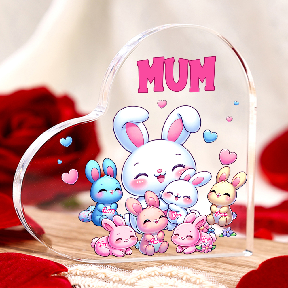 7 Names-Personalised Mum Rabbit Acrylic Heart Keepsake Custom Text Acrylic Plaque Ornaments Gifts Set With Gift Box for Nan/Mother for Easter