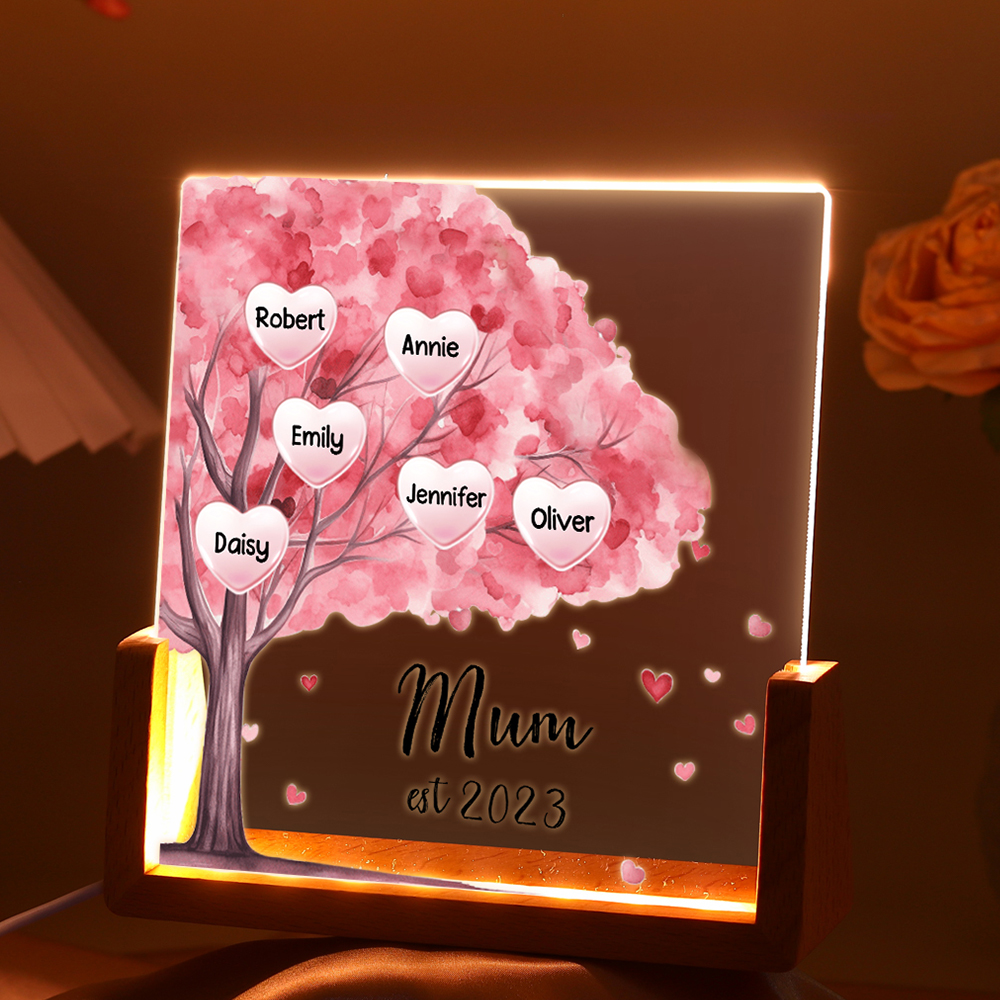 6 Names - Personalised Sakura Tree Night Light with Custom Text And Date LED Light, Gift for Mum