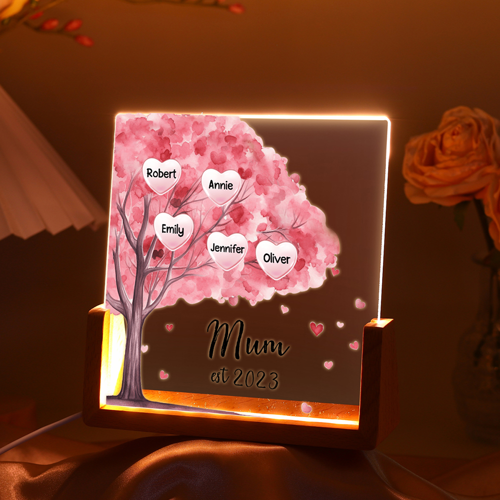 5 Names - Personalised Sakura Tree Night Light with Custom Text And Date LED Light, Gift for Mum