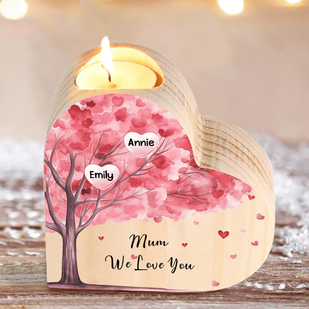 2 Names-Personalised Pink Heart Tree Heart-Shape Candlestick Set With Gift Box Custom Text Mother's Day Gift Wooden Custom Candle Holder For Family