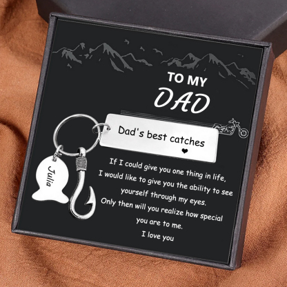 1 Name Personalised Fish Hook Charm Keyring Heart Tag Engraved Special Gift Set with Gift Box for Dad