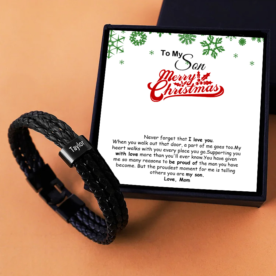 1 Name-Personalised To My Son Braided Leather Bracelet Christmas Gift Set with Gift Card Gift Box-Custom Bracelet Engraved 1 Name Men's Bracelet Gifts For Son