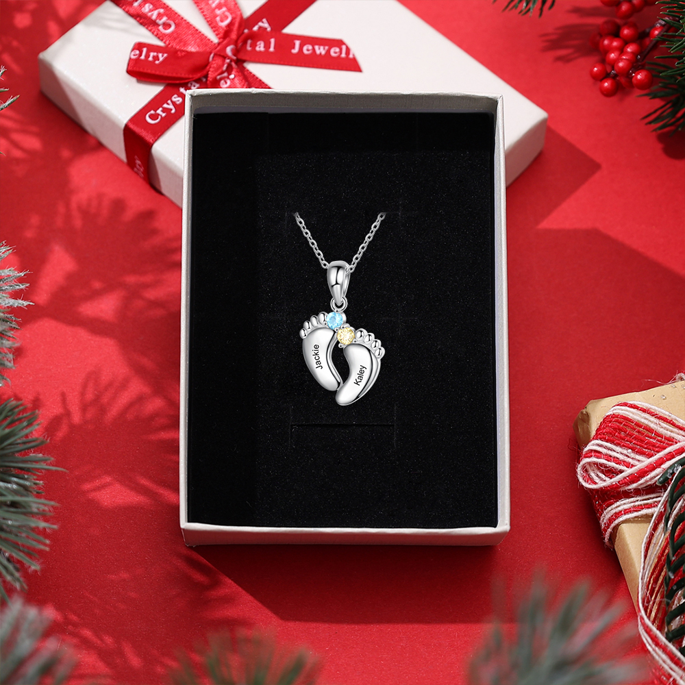 2 Names-Personalised Baby Foot Necklace Gift Set With Gift Box-Custom Women Necklace With 2 Birthstones Engraved Names Gift For Mother/Nan/Her