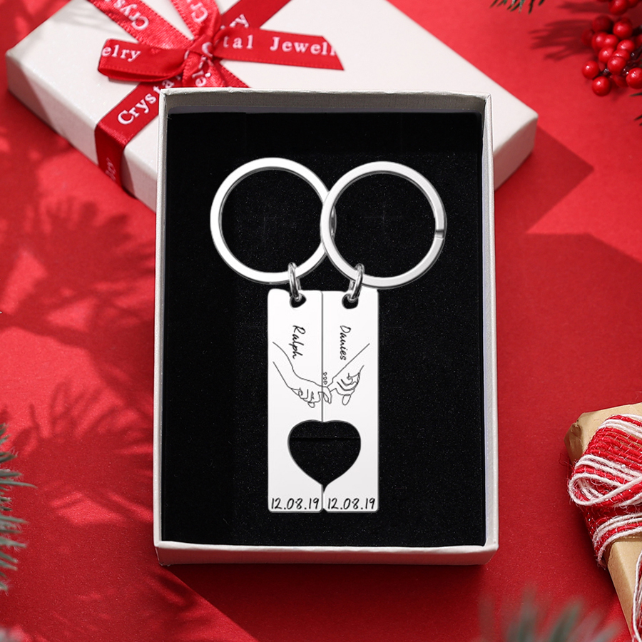 2-Names Personalised Hook Puzzle Couple Keyring Engrave Names And Date Matching Couple Gifts, Special Gift For Him/Her