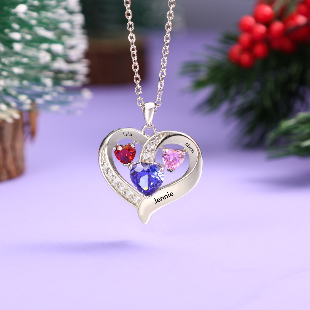 3 Names-Personalised Heart Necklace Set With Gift Card Gift Box-Custom 3 Birthstones Engraved Names Gift For Mum