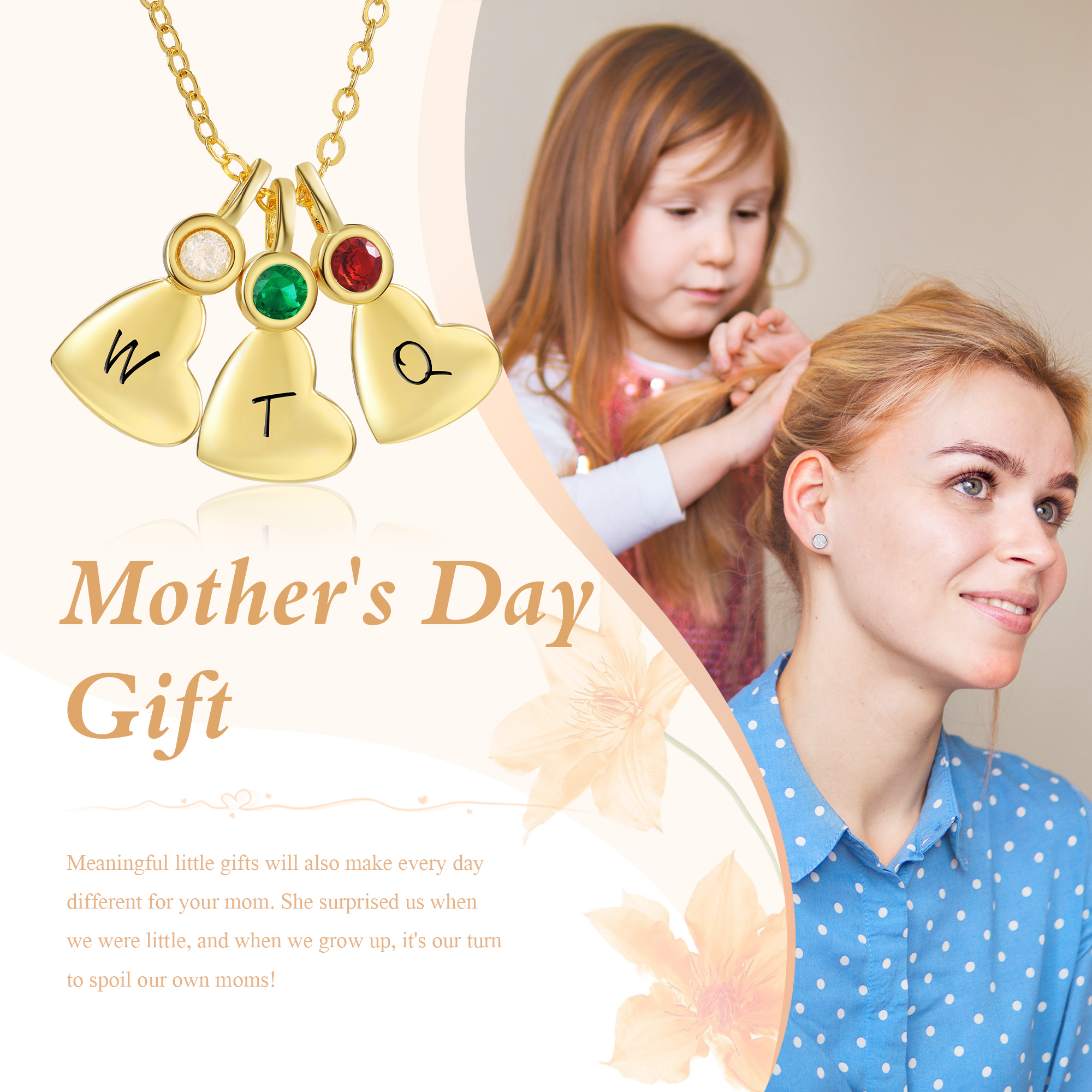 3 Birthstones Personalised Necklace Engraved 3 Heart Letters Special Gift For Women