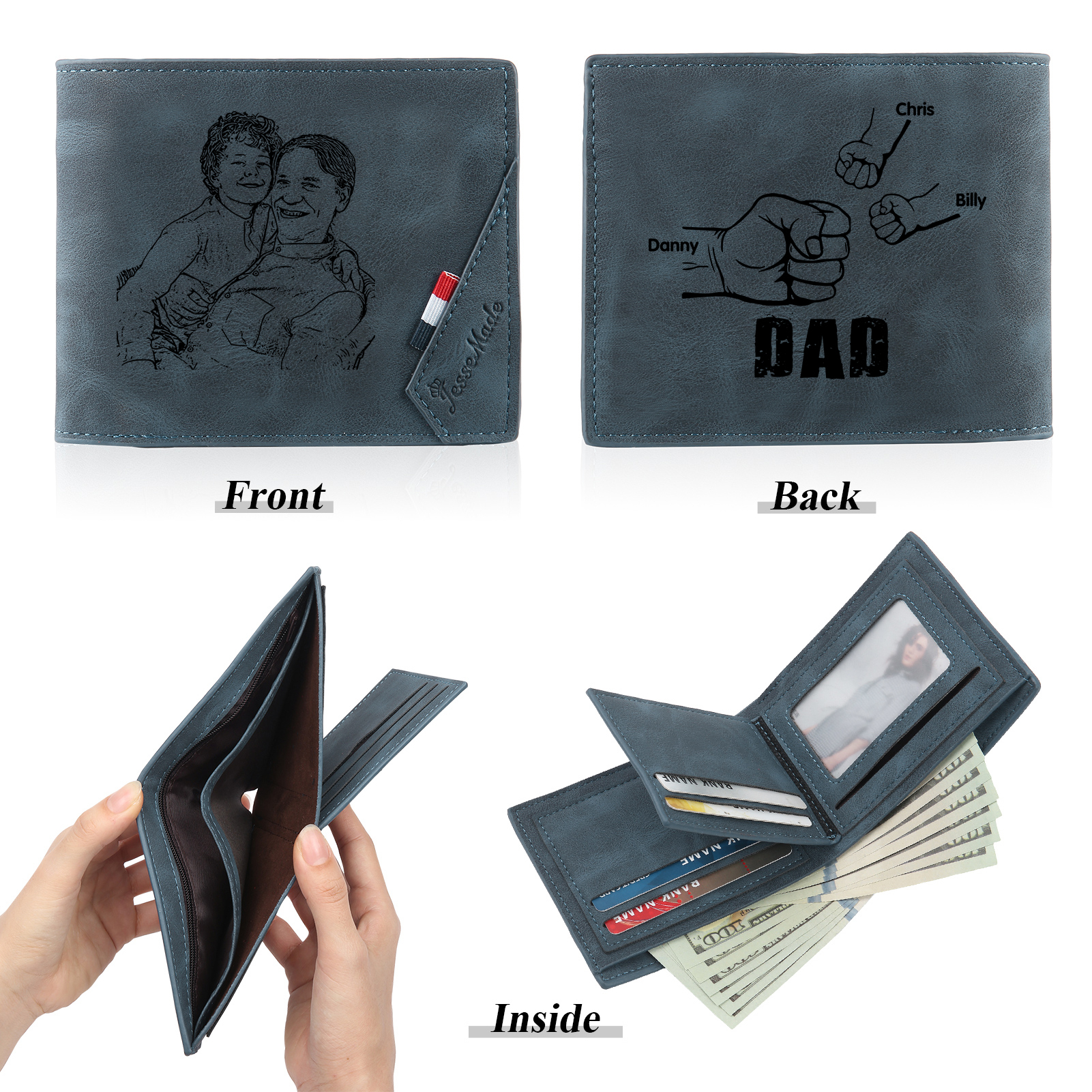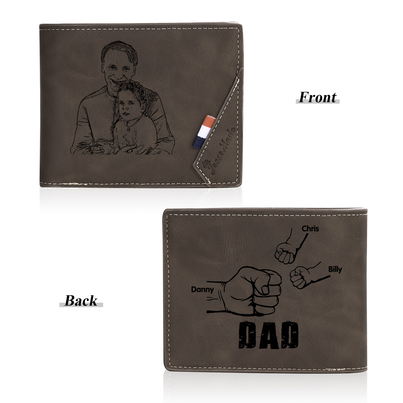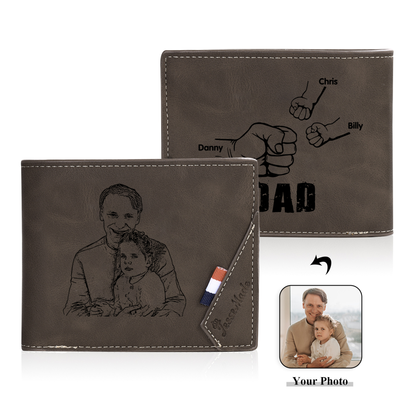 3 Names - Personalised Photo Custom Leather Men's Wallet as a Father's Day Gift for Dad