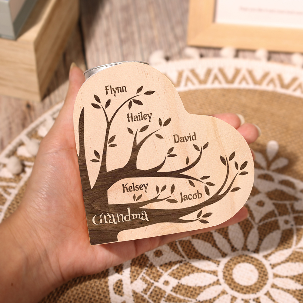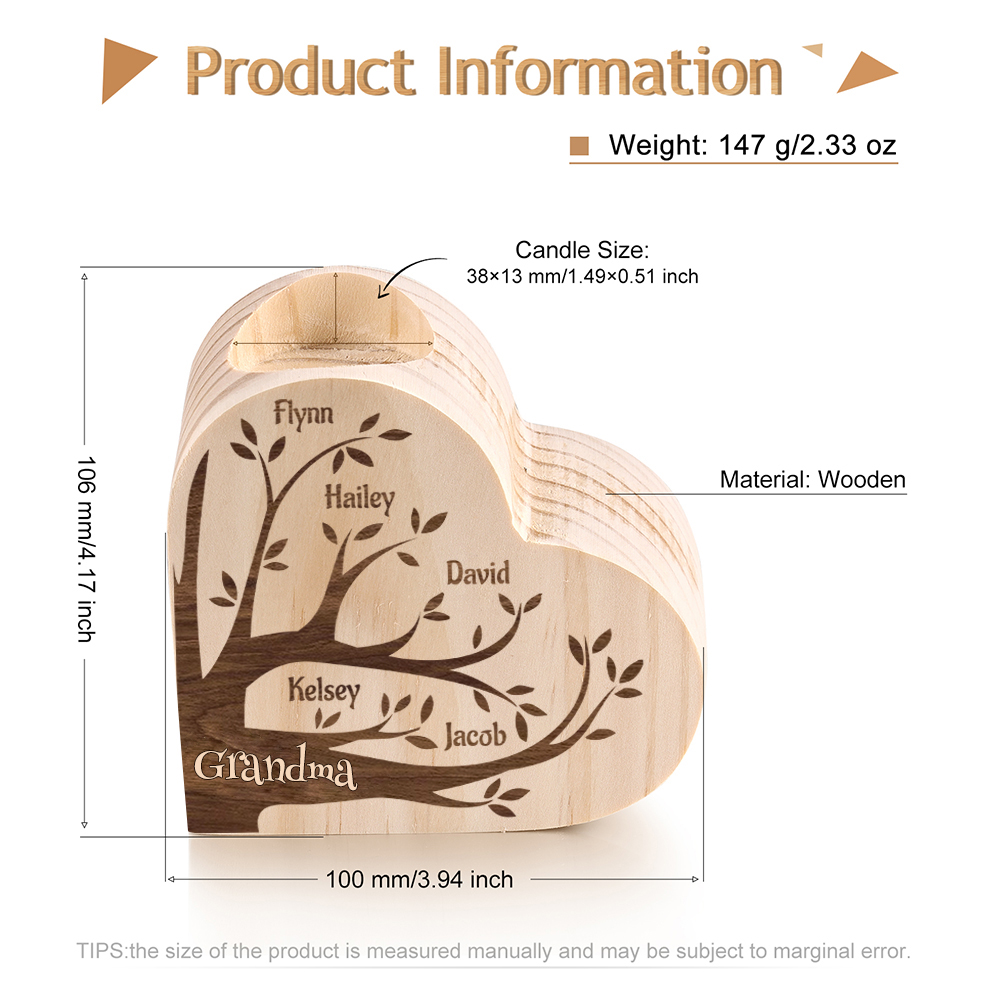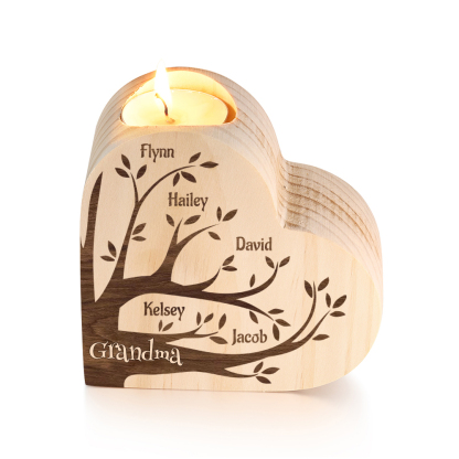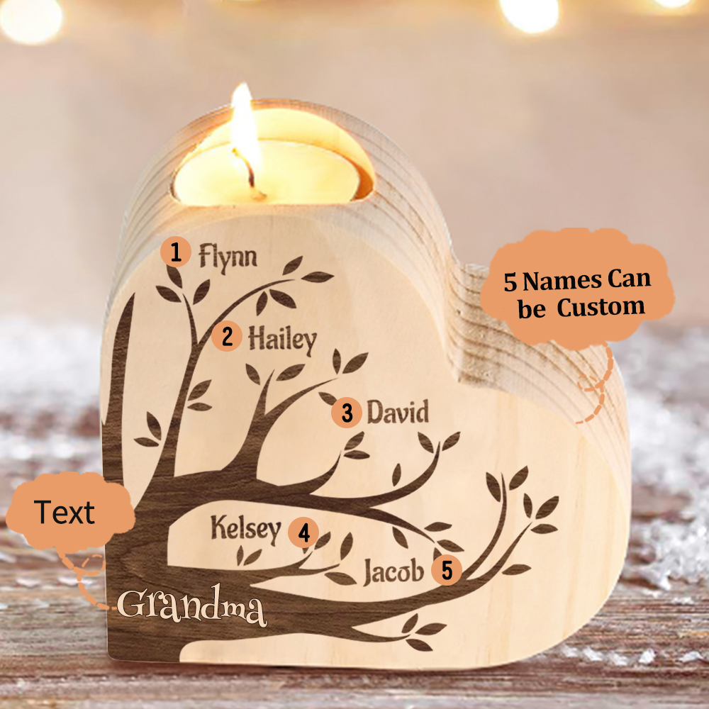 5 Names-Custom Family Tree Wooden Candlestick-Personalised Names Heart Candle Holder Christmas Gift for Family