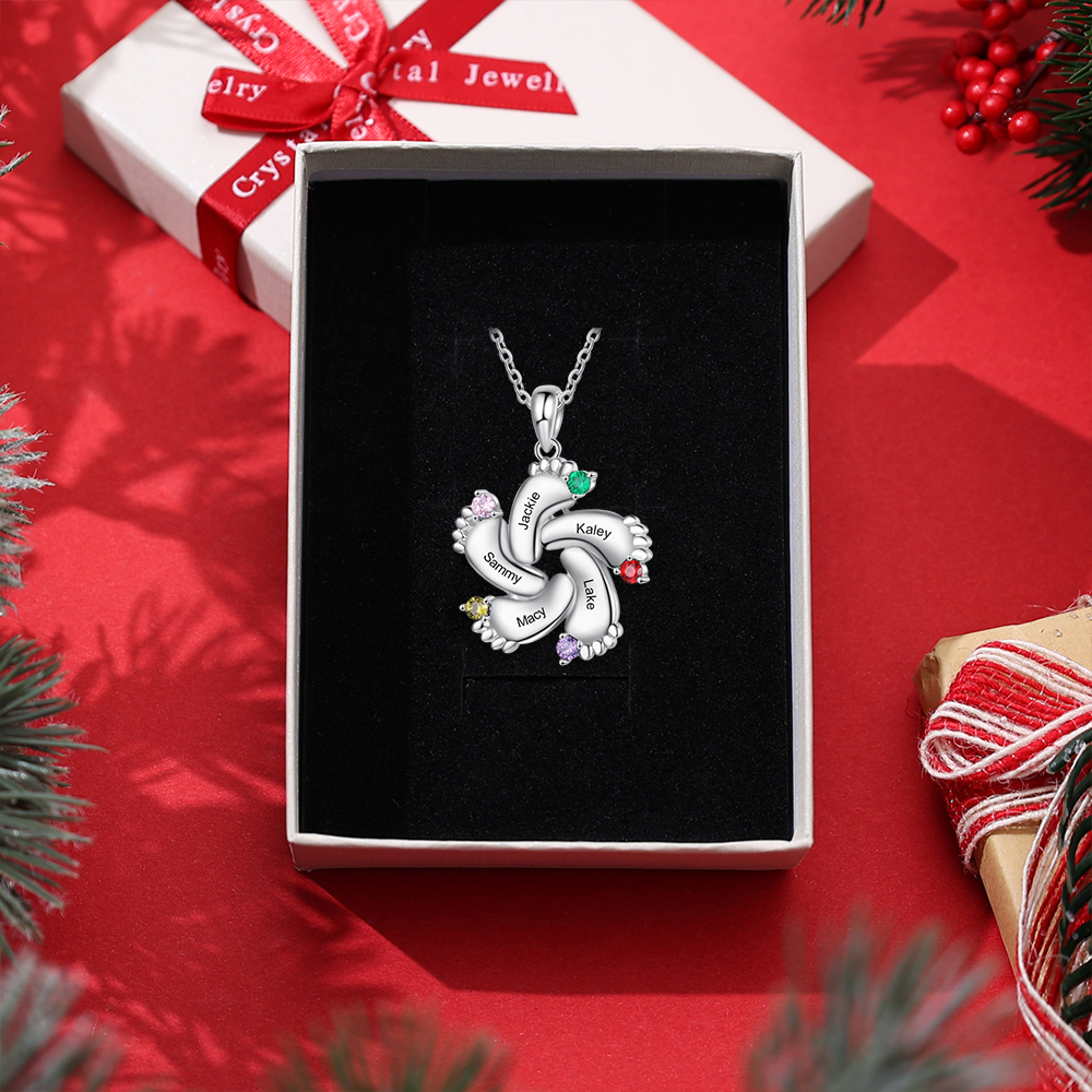 5 Names-Personalised Baby Foot Necklace Set With Gift Box-Custom Women Necklace With 5 Birthstones Engraved Names Gift For Mother/Nan/Her