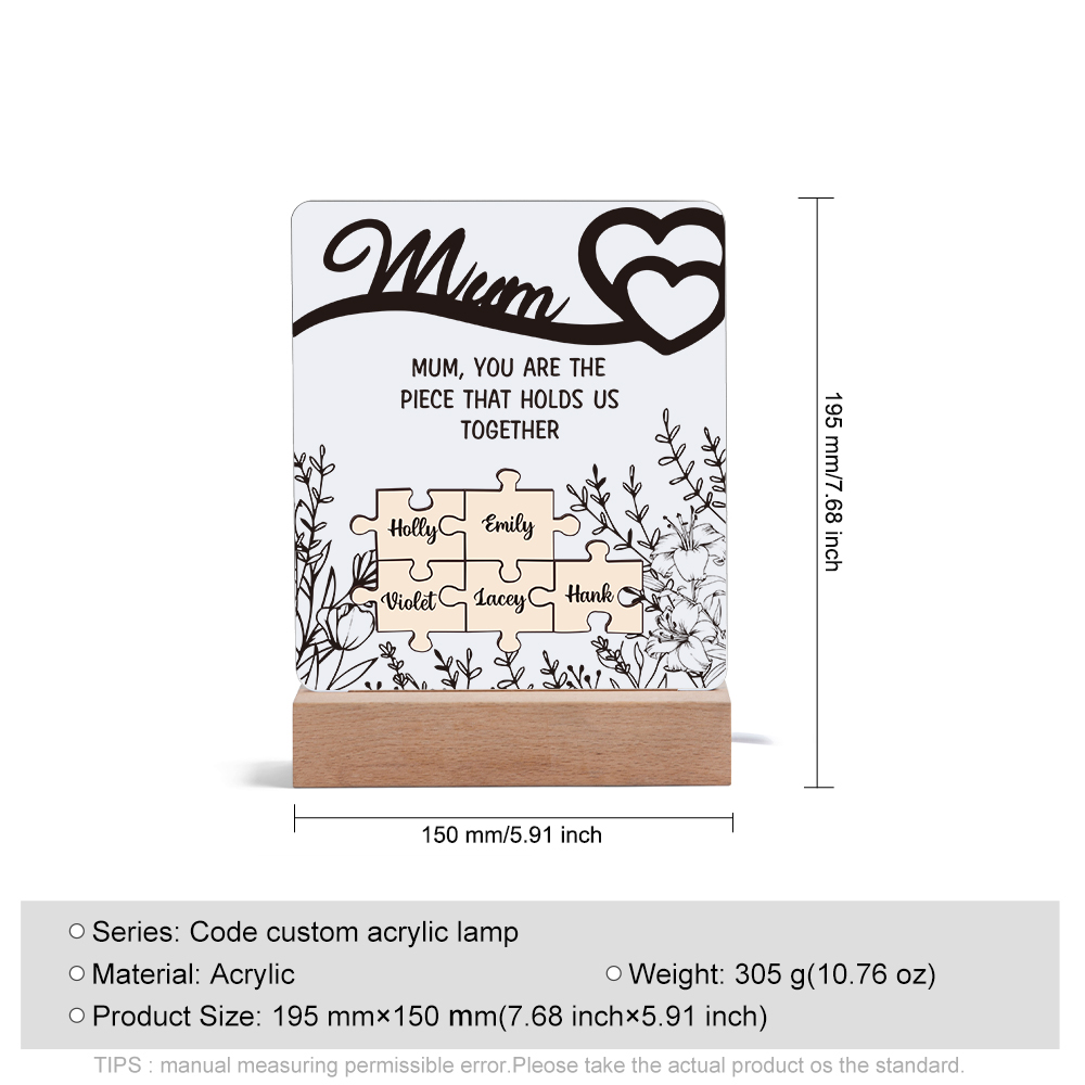 5 Names-Personalised Family Puzzle Acrylic Night Light, Mum You Are The Piece That Holds Us Together Mother's Gift For Mum