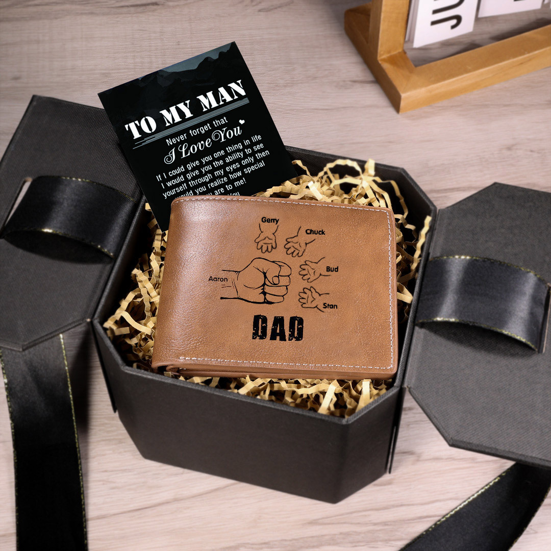 5 Names-Personalised Leather Men Wallet Engraved 5 Names Fist Bump Folding Wallet Gift Set For Dad
