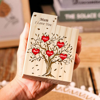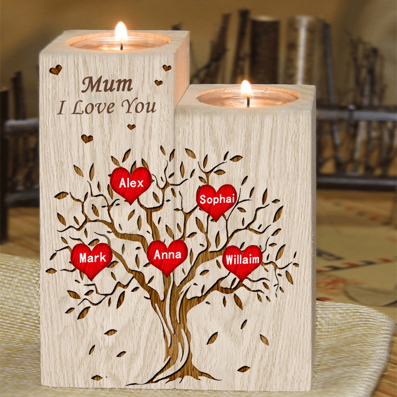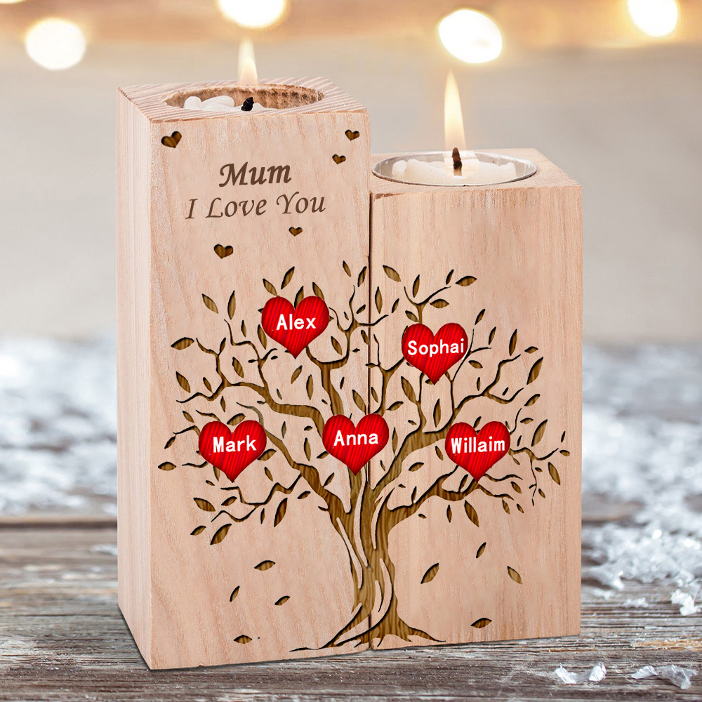 5 Names-Personalised Mum/Nan Family Tree Wooden Candle Holder, Custom Name And Text Family Candlestick for Mother/Grandma