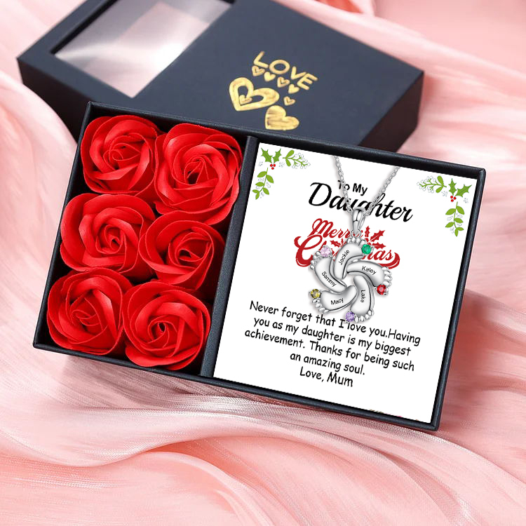 5 Names-Personalised To My Daughter Baby Foot Necklace Set With Gift Card Rose Box-Custom Women Necklace With 5 Birthstones Engraved Names Gift For Mother/Nan/Her