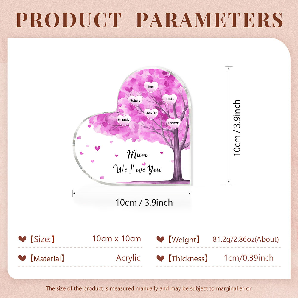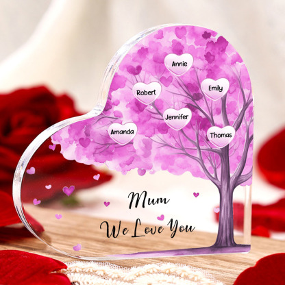 6 Names-Personalised Mum Acrylic Heart Keepsake Custom Text Pink Tree Ornaments Gifts Set With Gift Box for Grandma/Mother