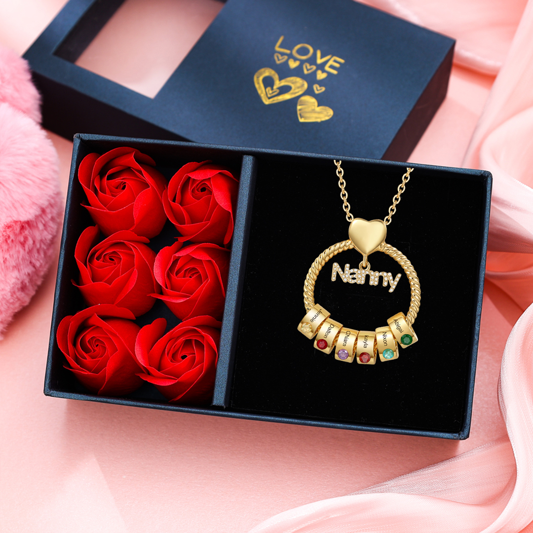 6 Names-Personalised Nanny Circle Necklace With 6 Birthstones Pendant Engraved Names Gift Set With Rose Gift Box For Nanny
