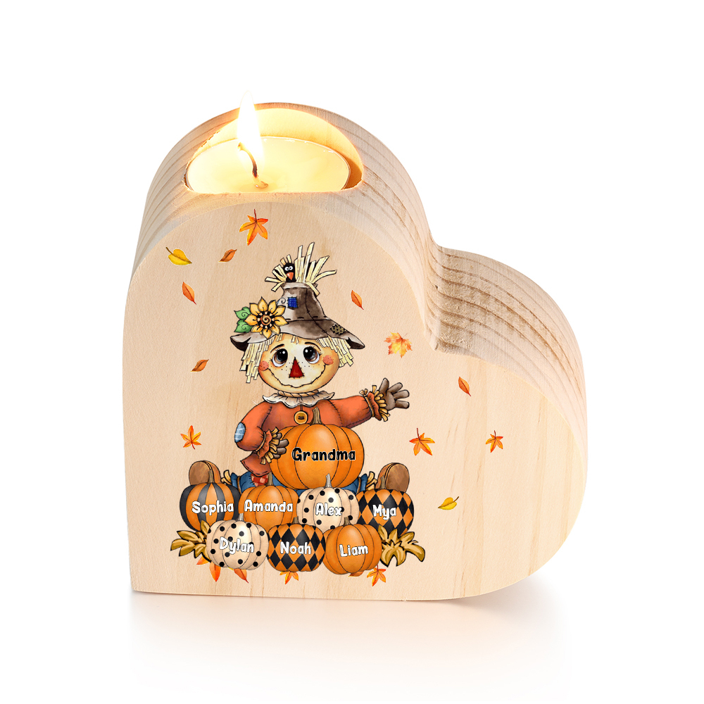 8 Names-Custom Halloween Wooden Candlestick-Personalised Names Pumpkin Heart Candle Holder Halloween Gift for Family