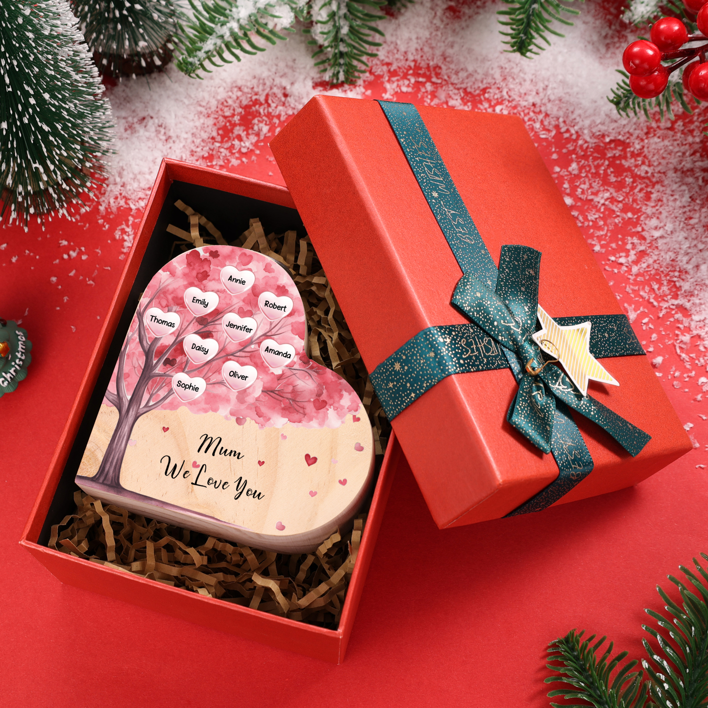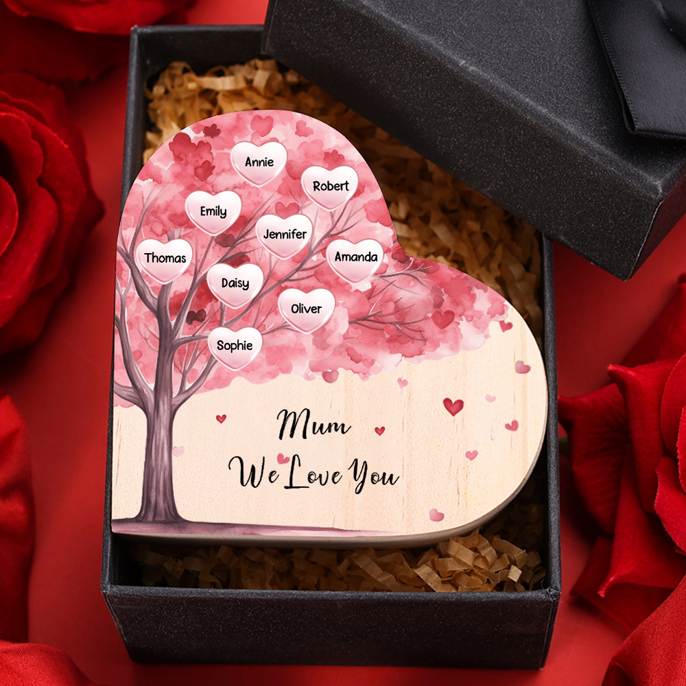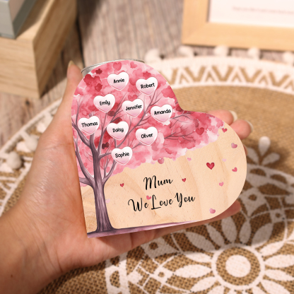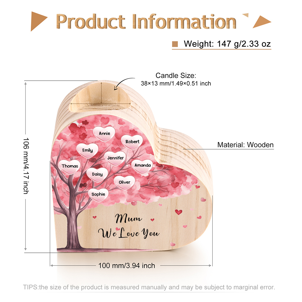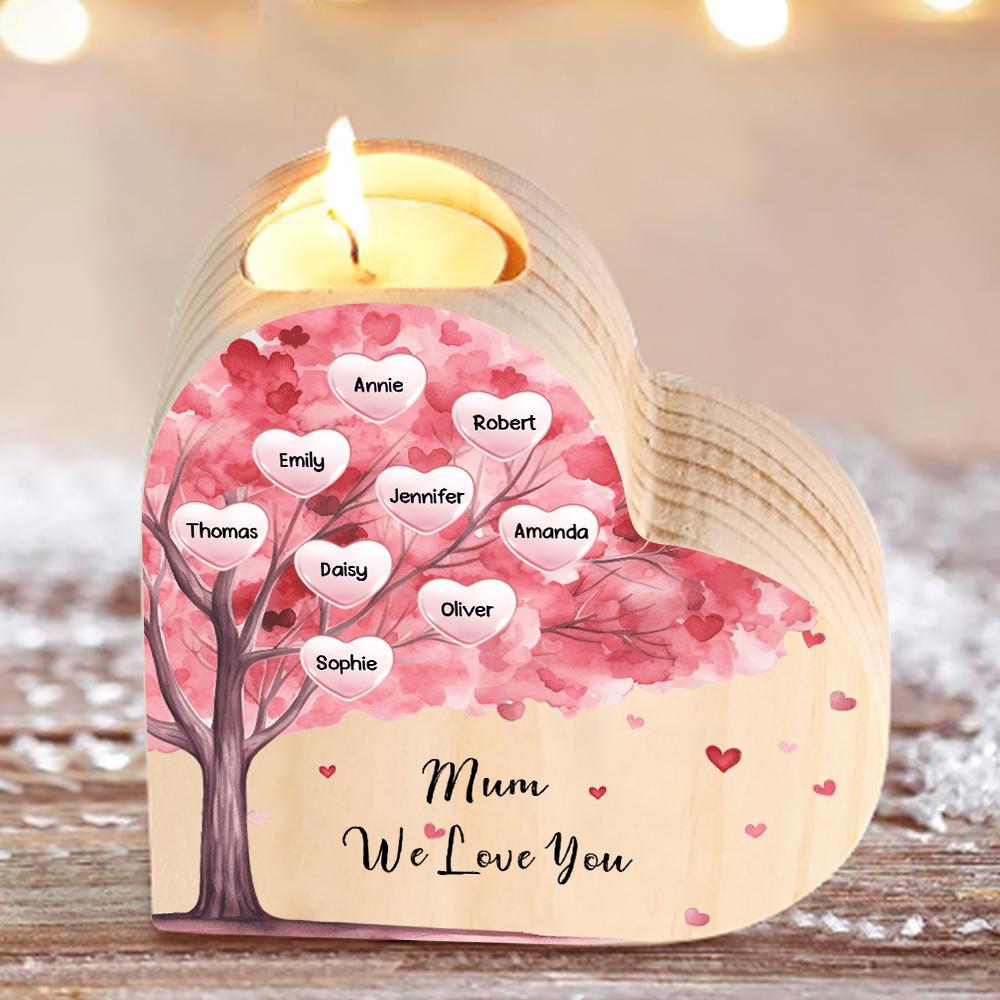 9 Names-Personalised Pink Heart Tree Heart-Shape Candlestick Set With Gift Box Custom Text Mother's Day Gift Wooden Custom Candle Holder For Family