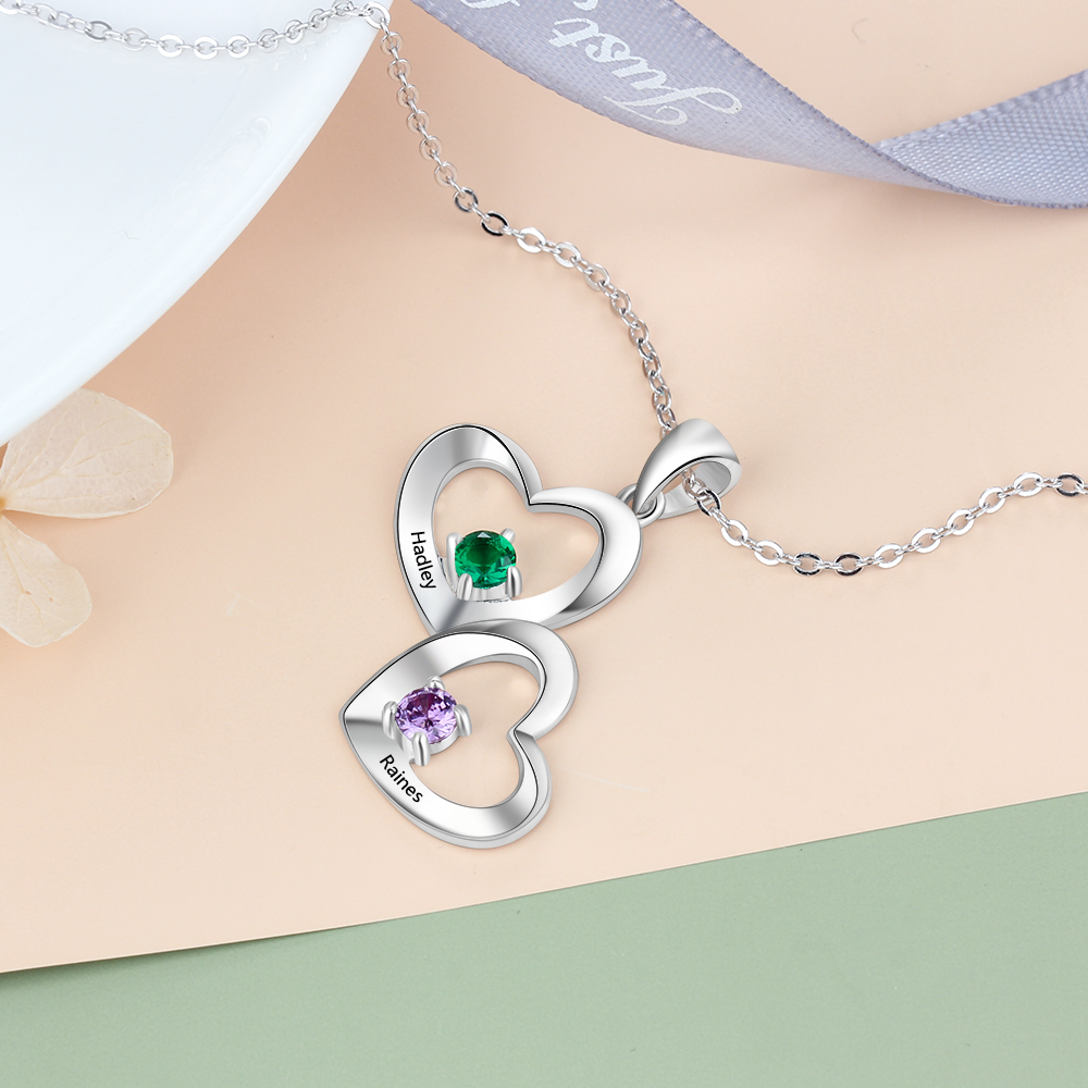 Personalised Heart Necklace With 2 Birthstones Engraved Names Necklace Gift For Women