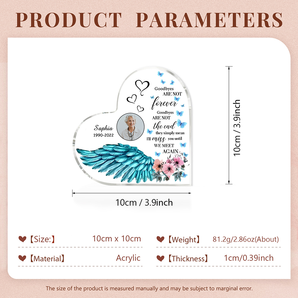 Blue Angel Wings-Personalised Memorial Acrylic Heart Keepsake Desktop Ornament-Goodbyes Are Not The End