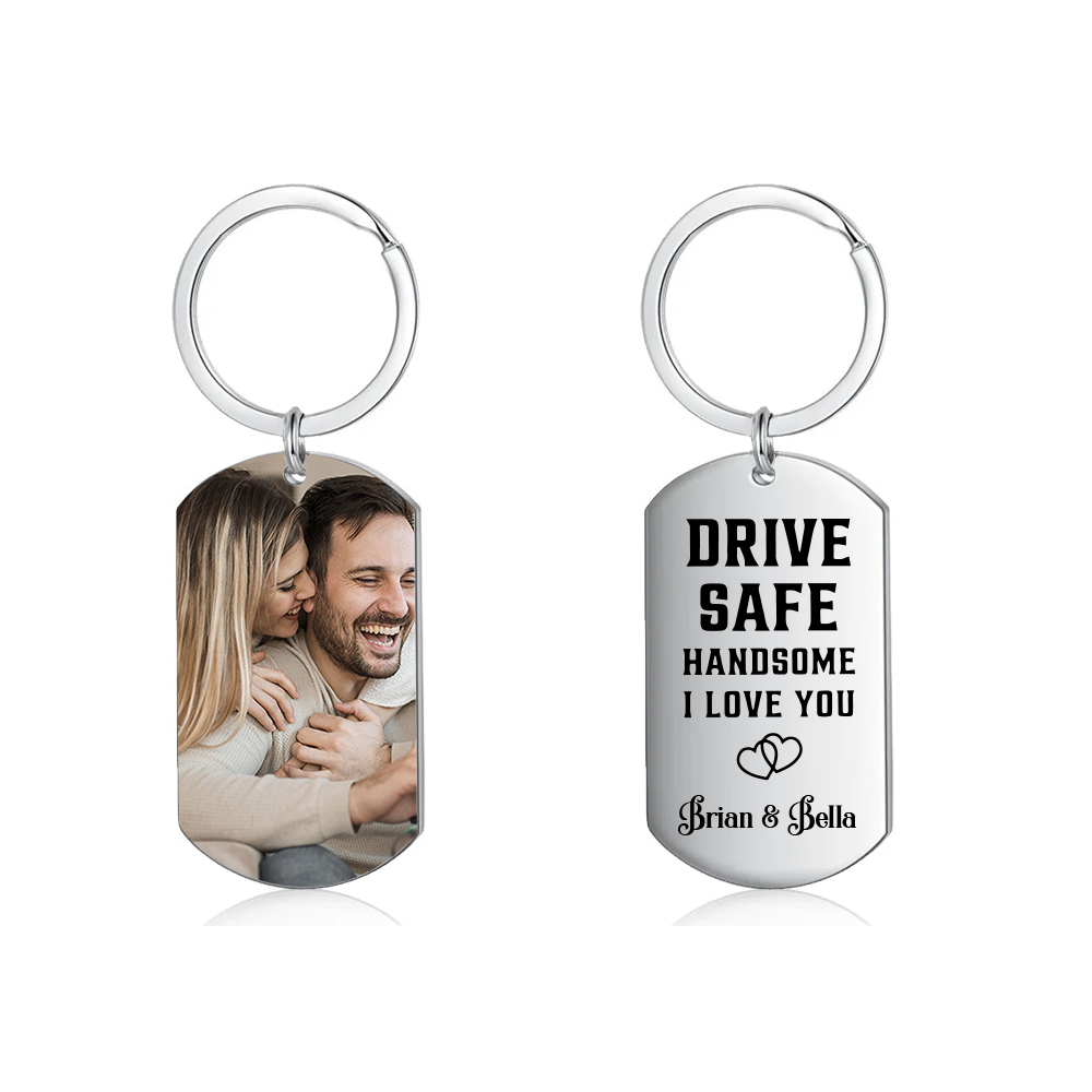 Custom Couple Photo Keyring With Name, Personalised Drive Safe Keyring for Boyfriend/Him