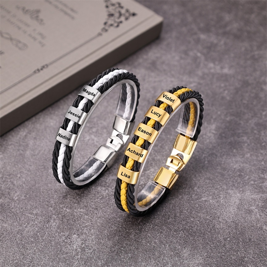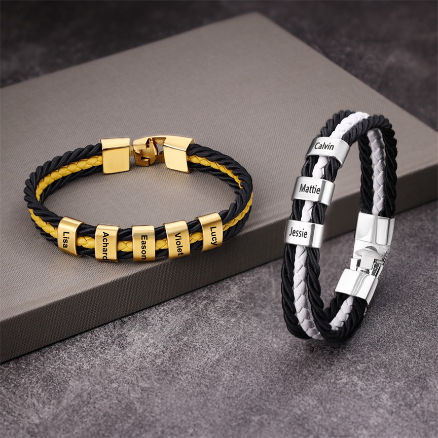 Mens Leather Bracelet Braided Layered Leather with 2 Beads Silver and Gold
