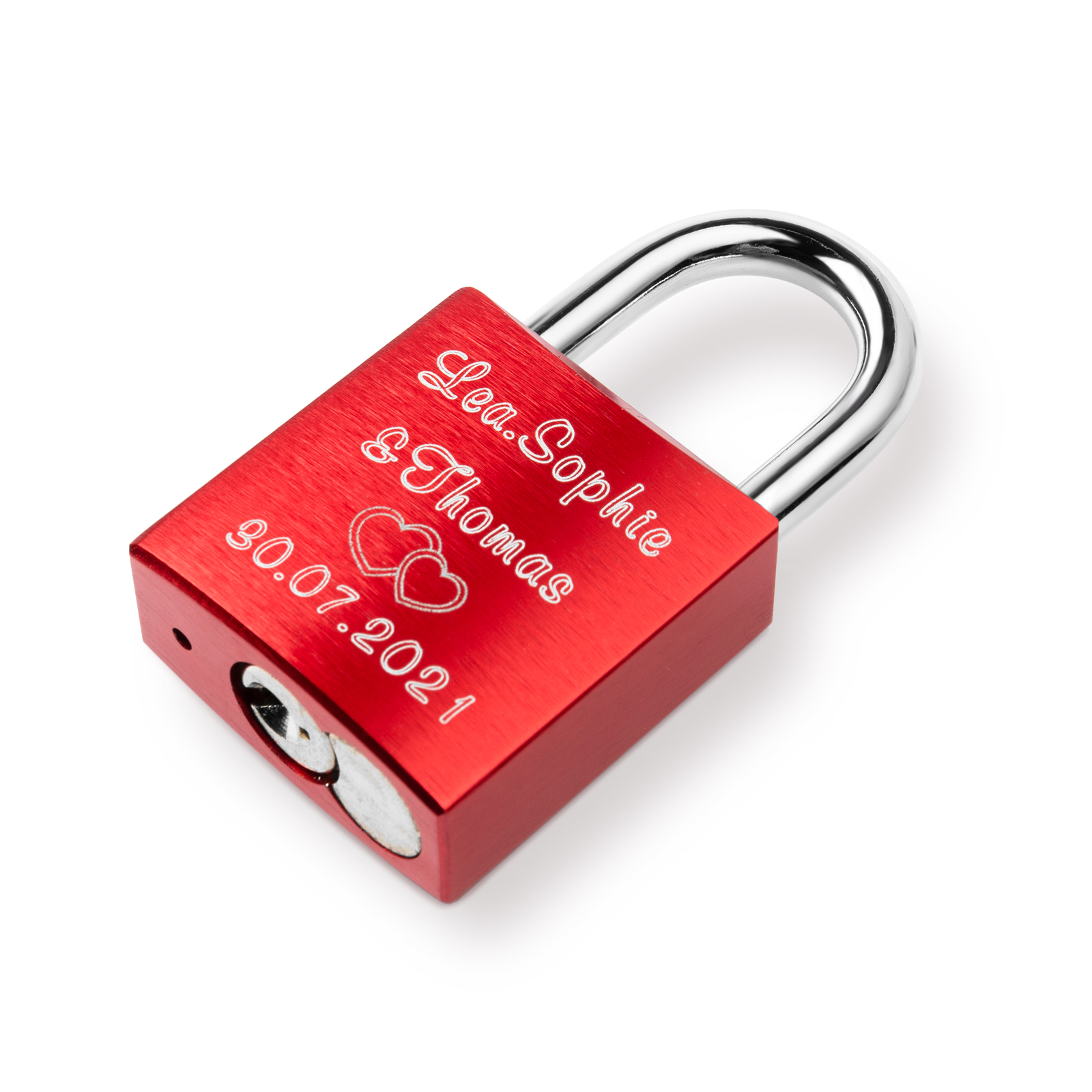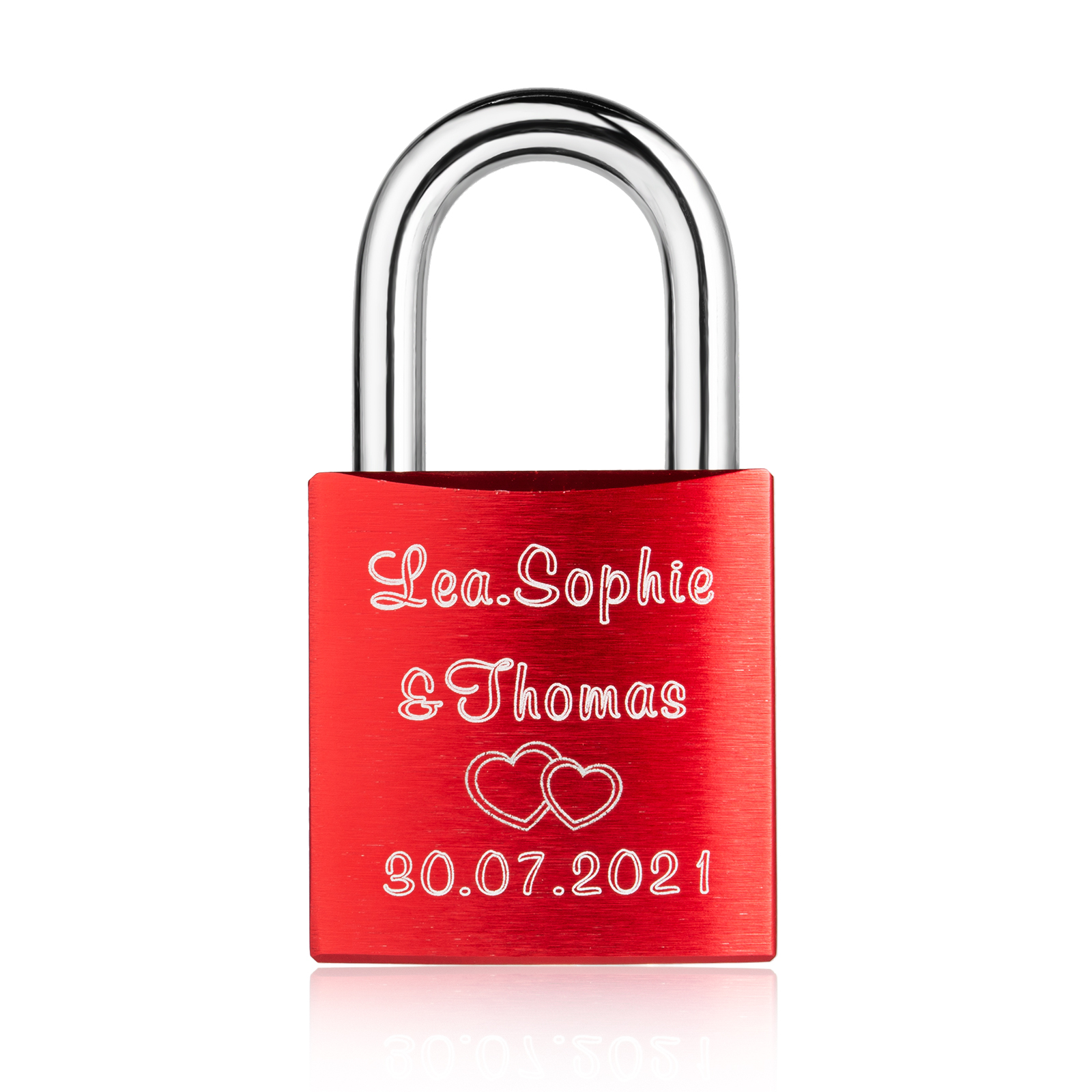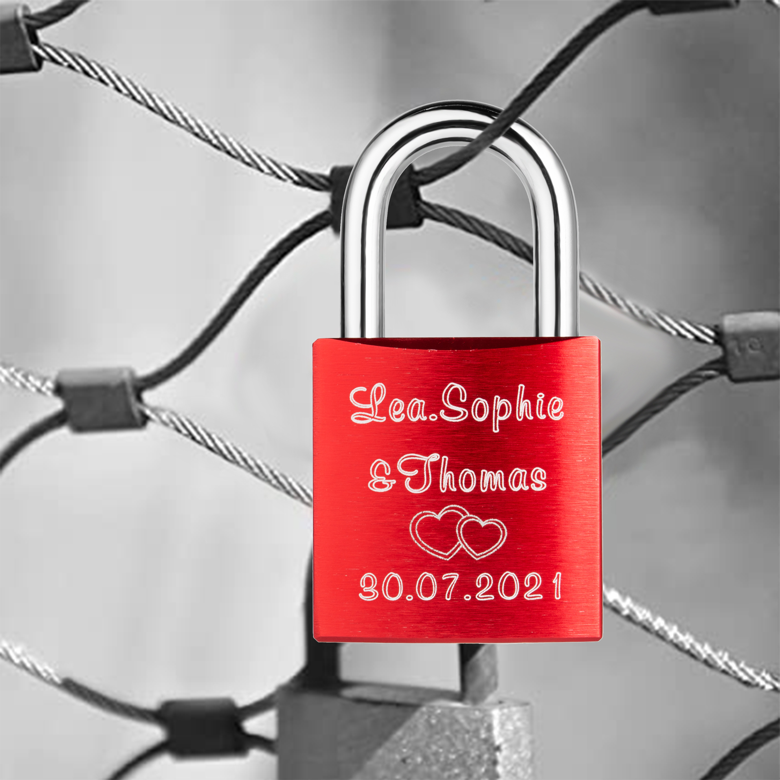 Our locks are engraved by a laser engraver to creat permanent, clean, and beautiful inscriptions. A high intensity laser removes the anodized color of the lock, leaving behind the bright exposed aluminum.
