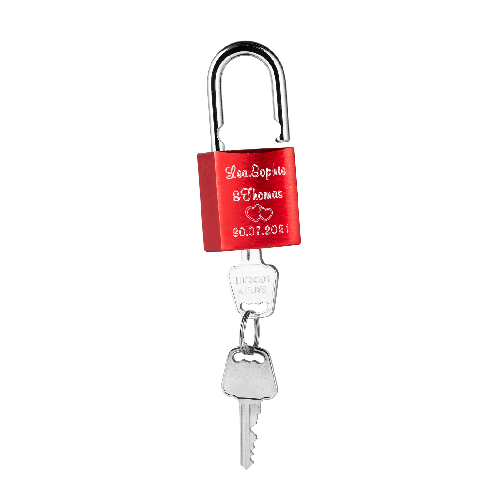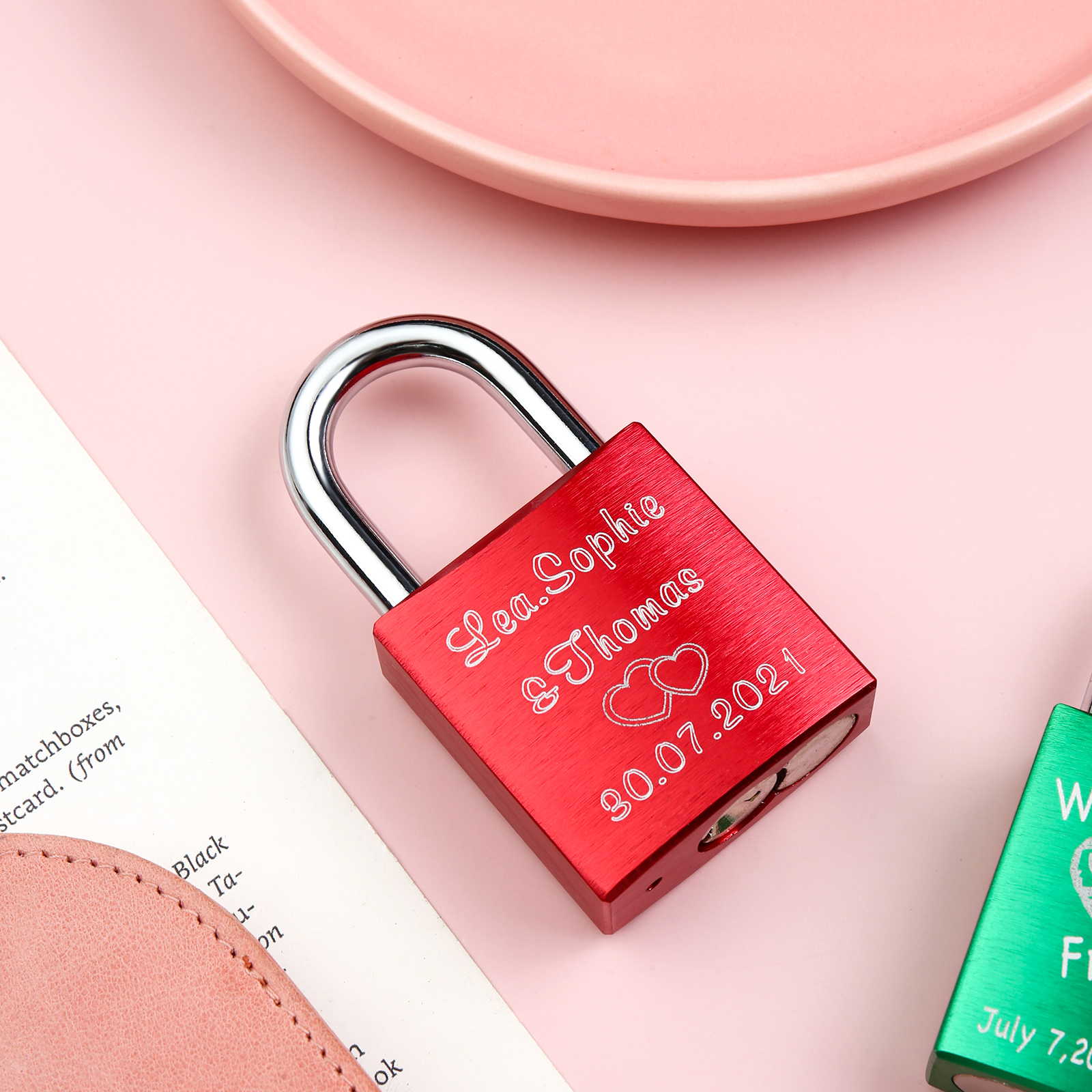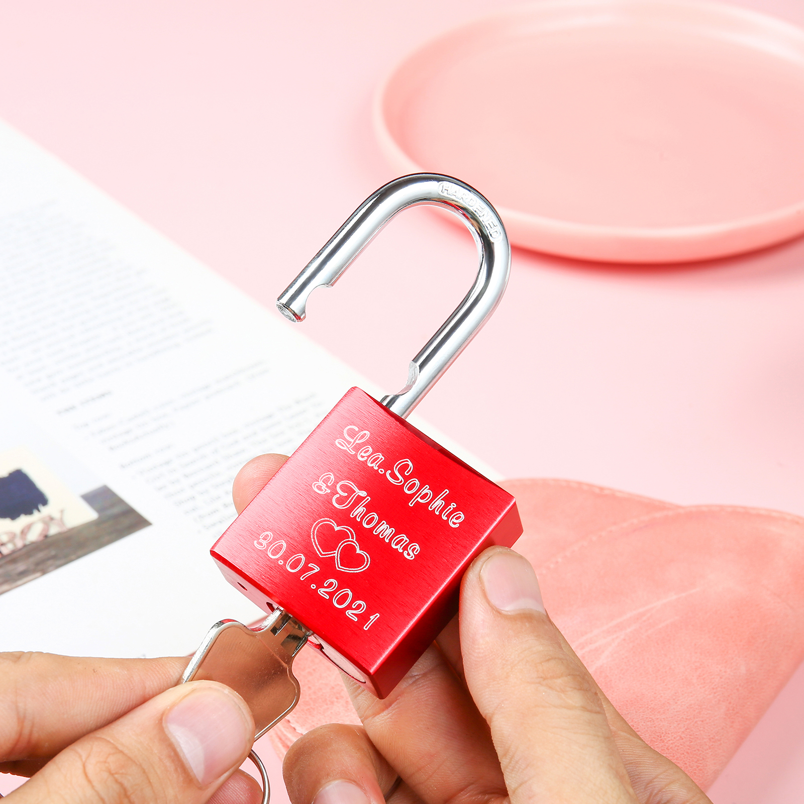 Our locks are engraved by a laser engraver to creat permanent, clean, and beautiful inscriptions. A high intensity laser removes the anodized color of the lock, leaving behind the bright exposed aluminum.