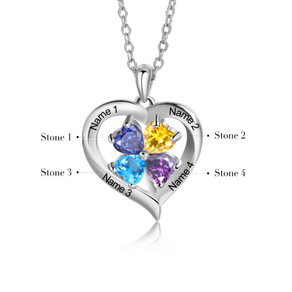 4 Names-Personalised Heart Necklace with 4 Birthstones Set With Gift Card Gift Box-Custom Engrave Names Family Necklace for Mum