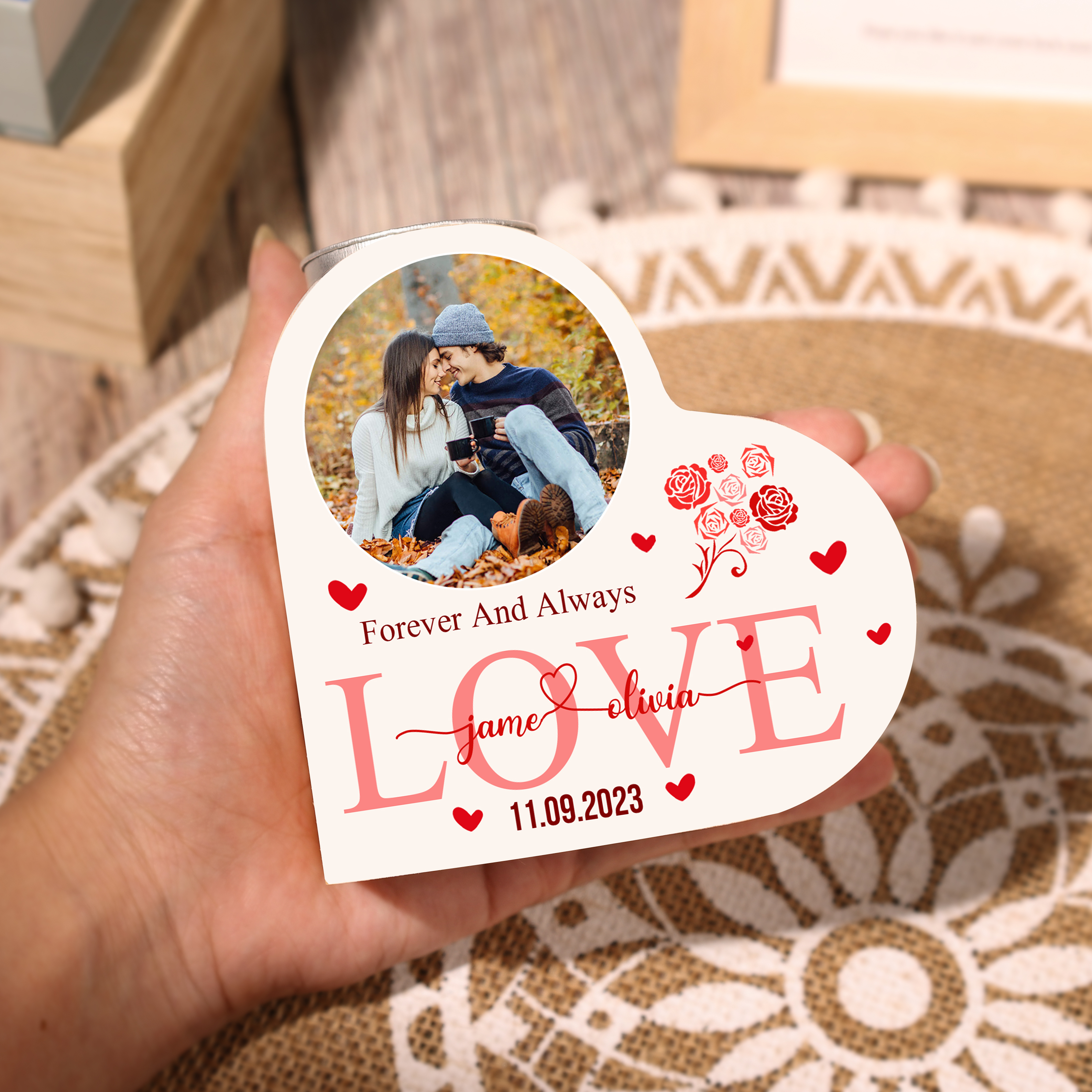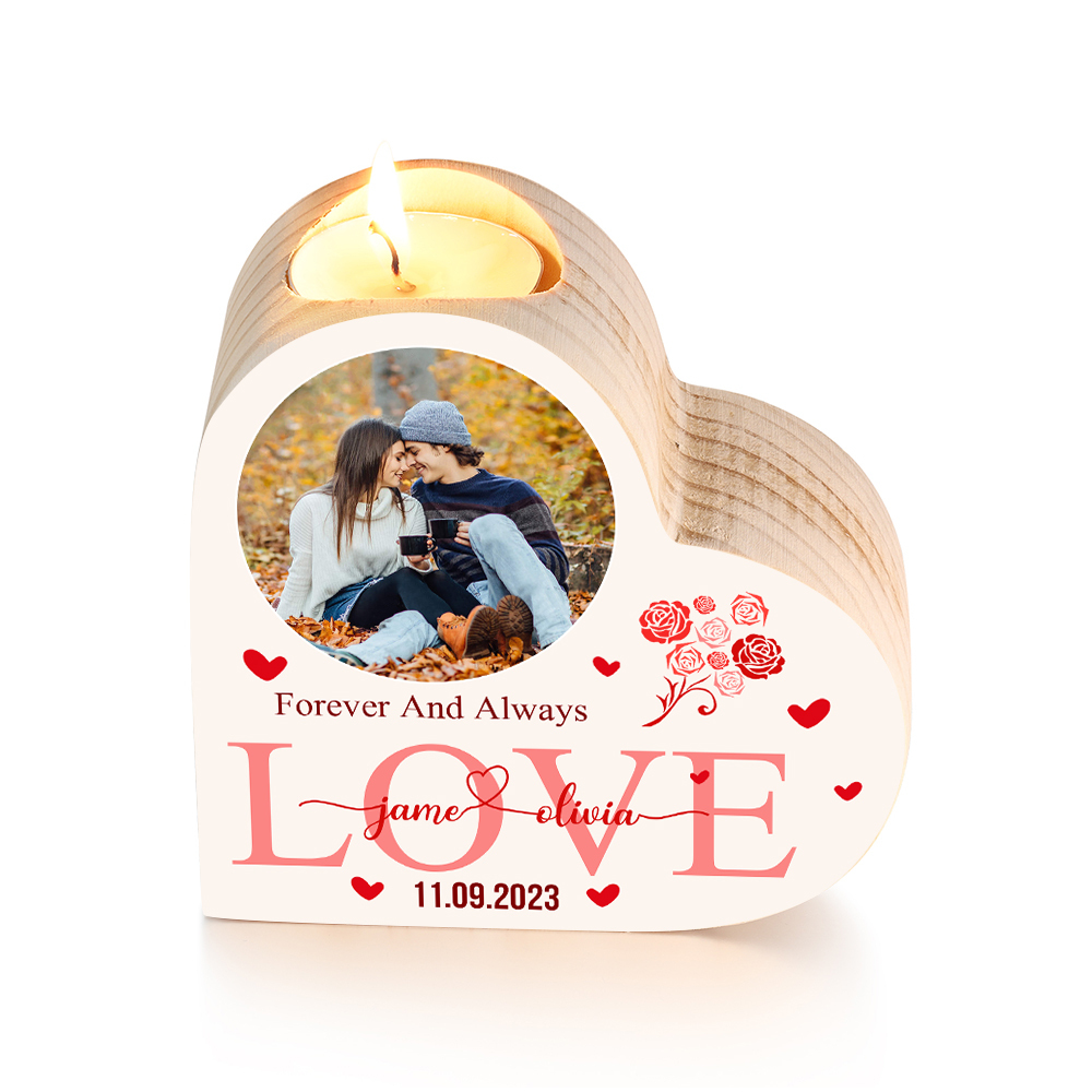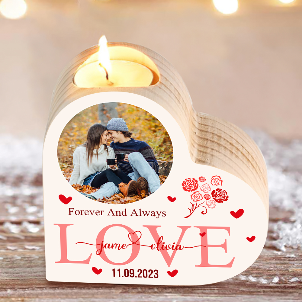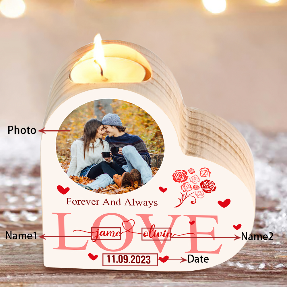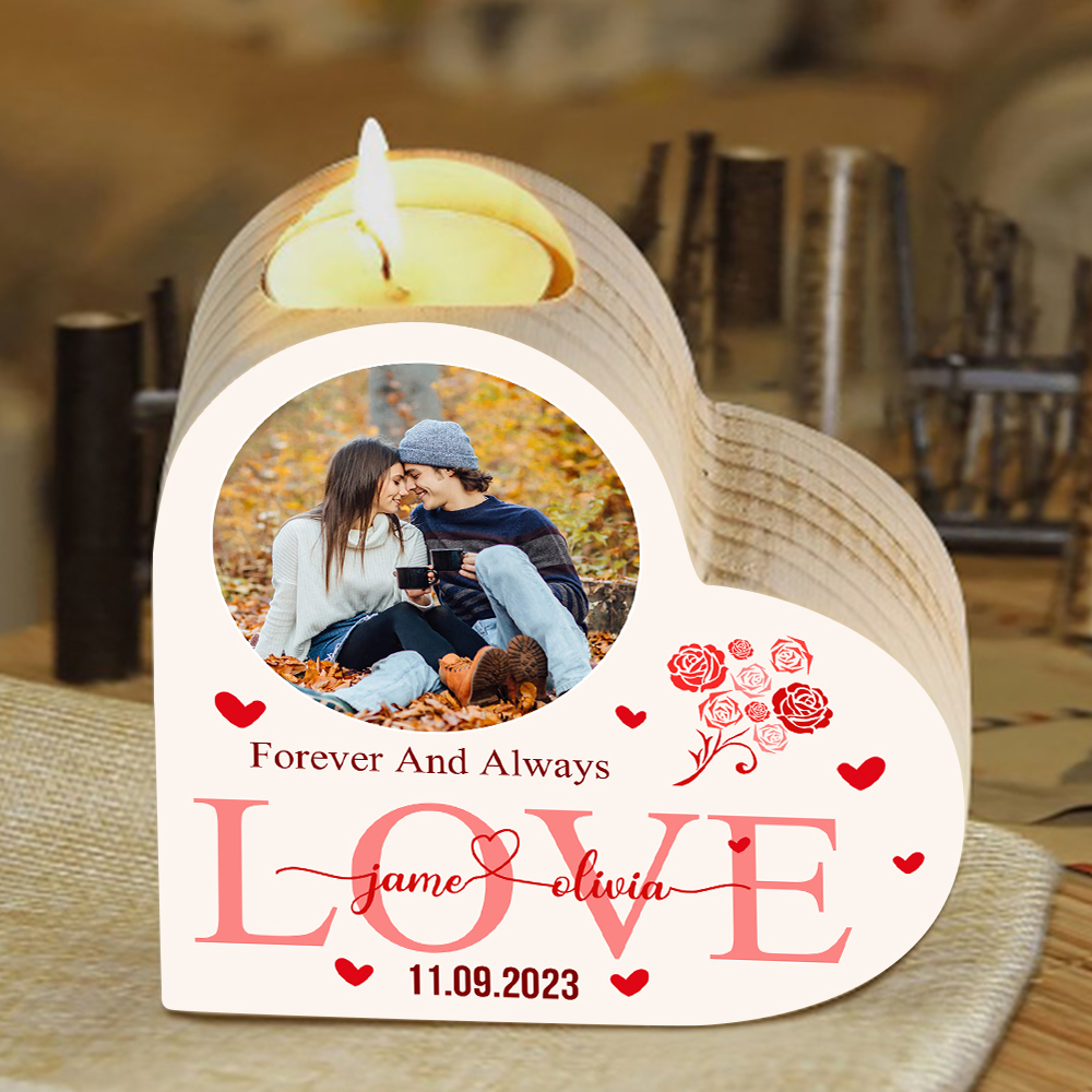 Personalised Love Couple Heart Candle Holder Engrave Photo-Forever And Always Love- Wooden Candlesticks Valentines Gift