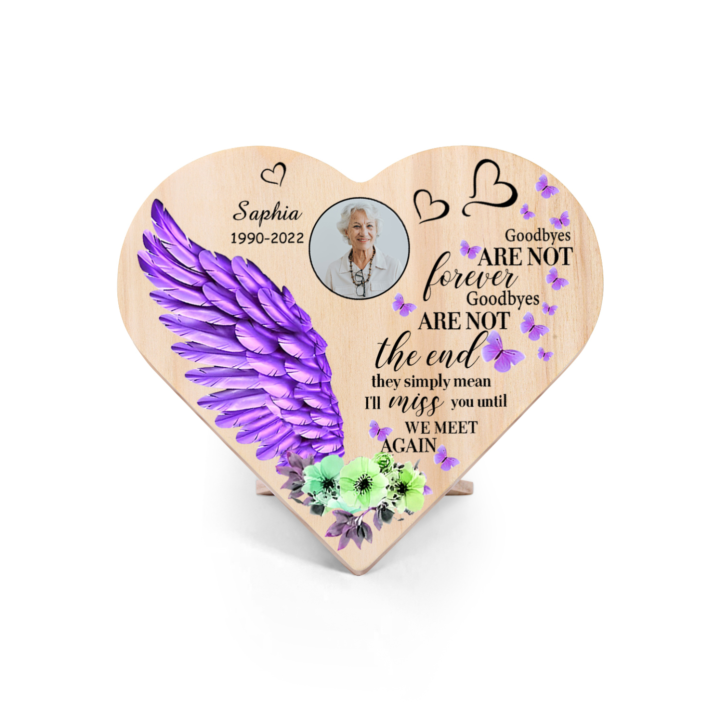 Personalised Memorial Purple Angel Wings Wood Heart Ornament-Custom Heart Wooden Desktop Decoration-Goodbyes Are Not The End