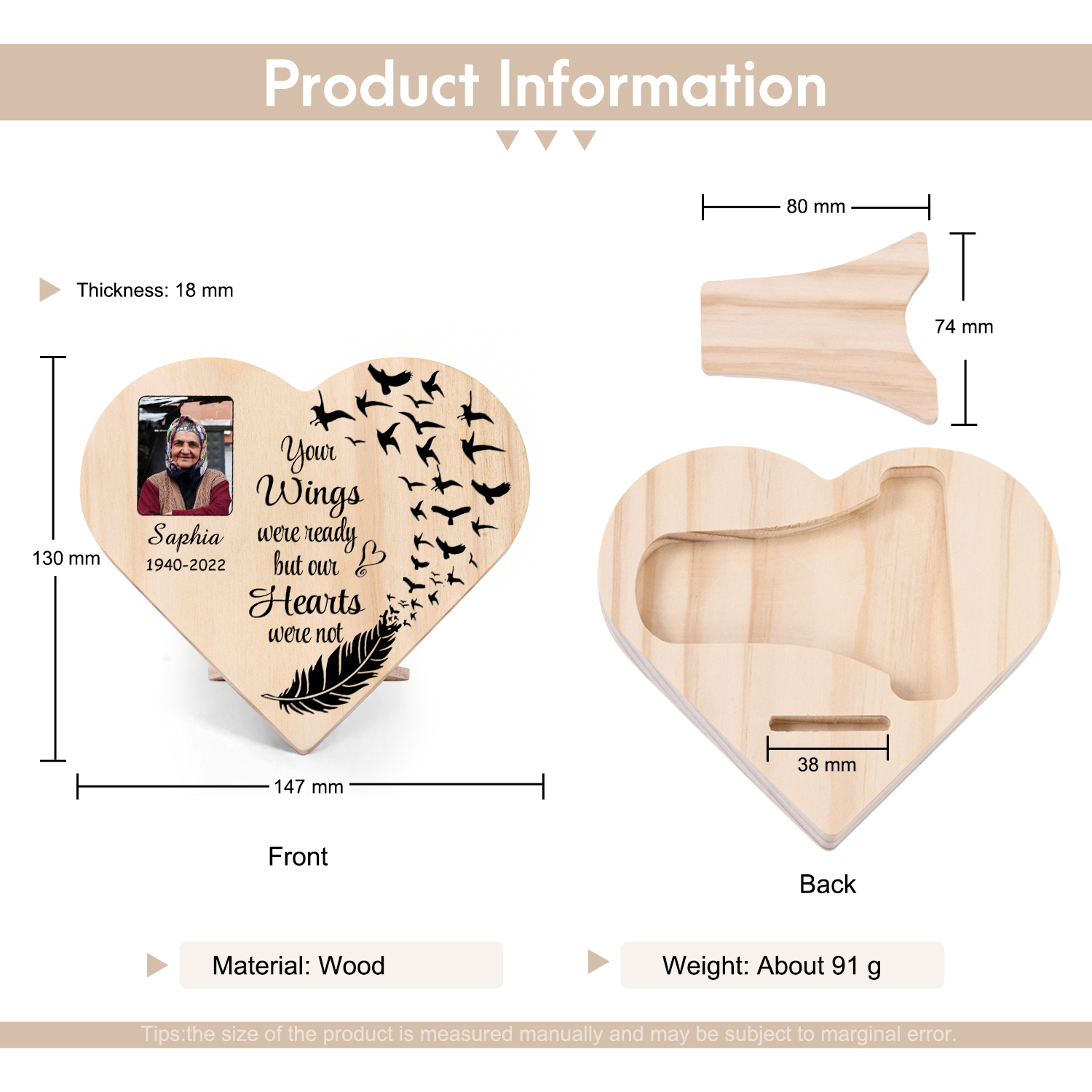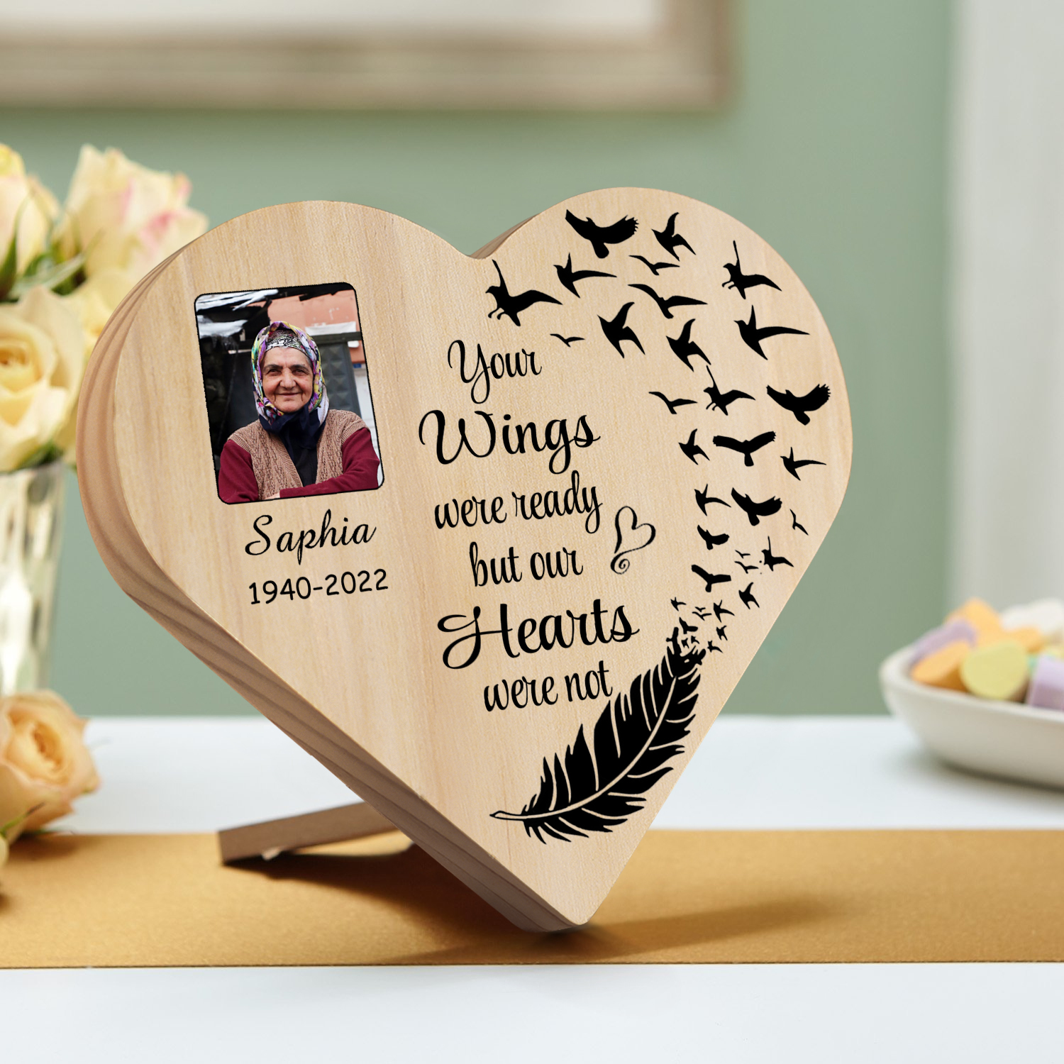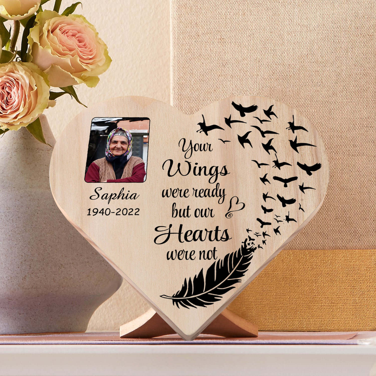 Personalised Memorial Wood Heart Ornament-Custom Heart Wooden Desktop Decoration-Your Wings Were Ready But My Heart Wasn't