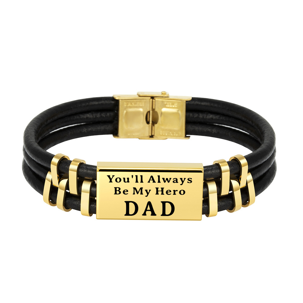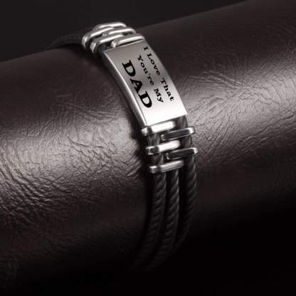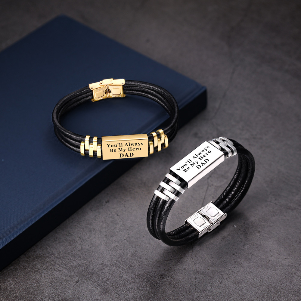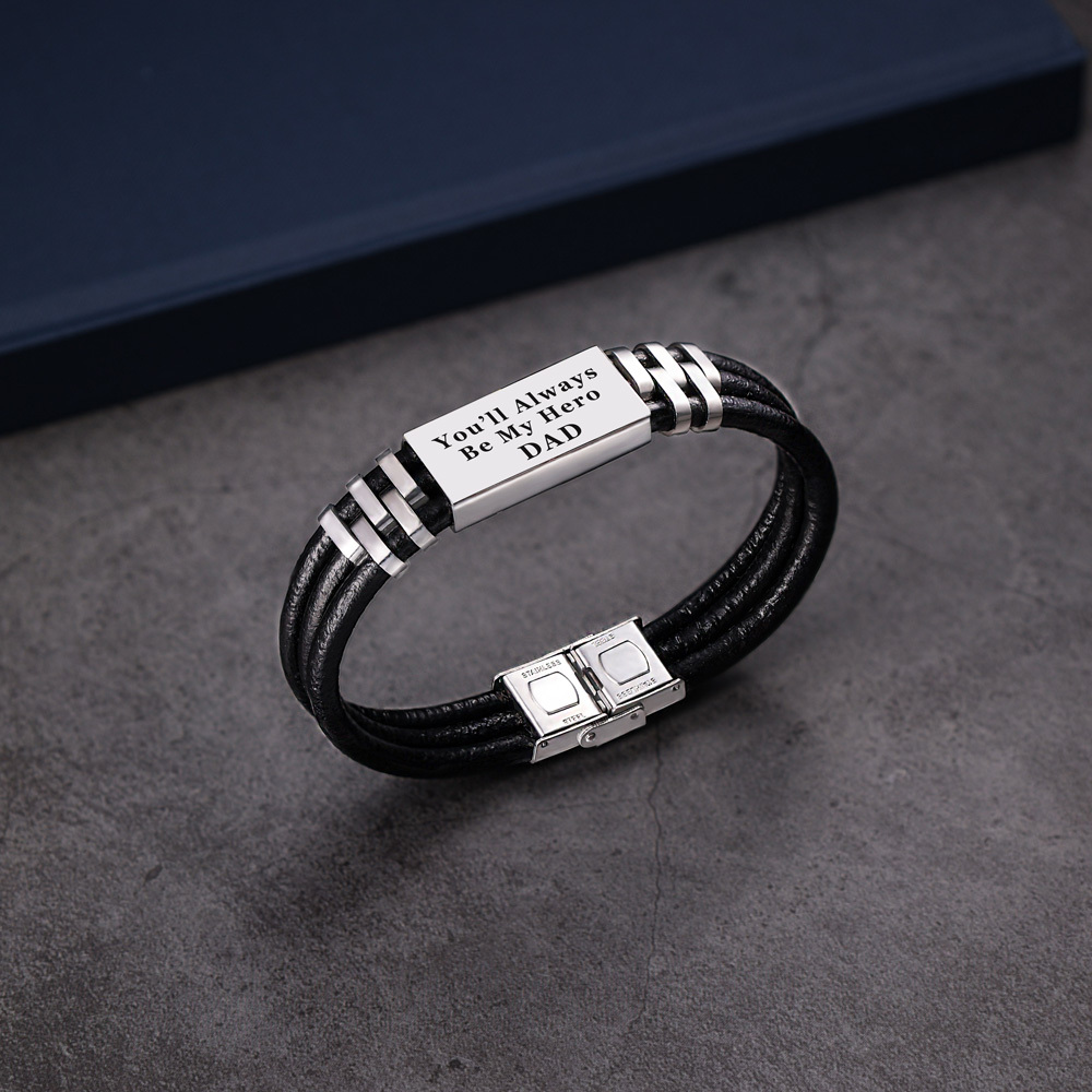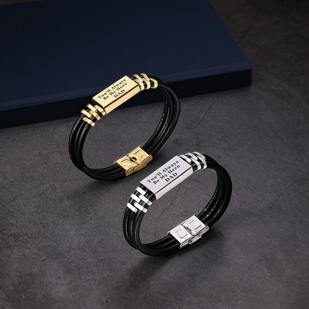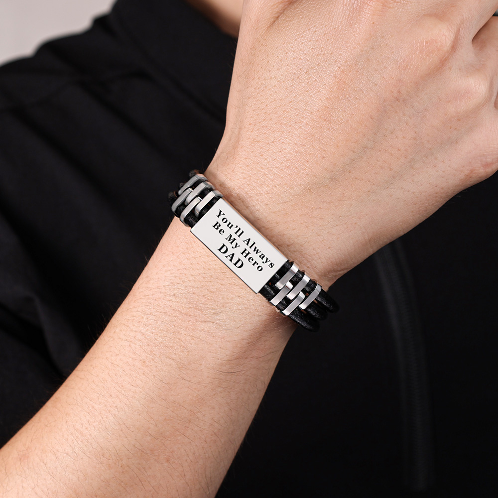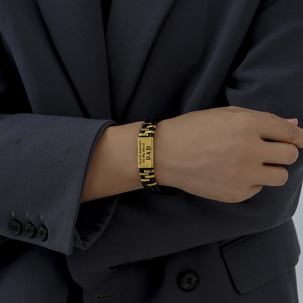 Personalised Men Leather Bracelet Engraved Name and Text ID Bar Bracelet Father's Day Gift