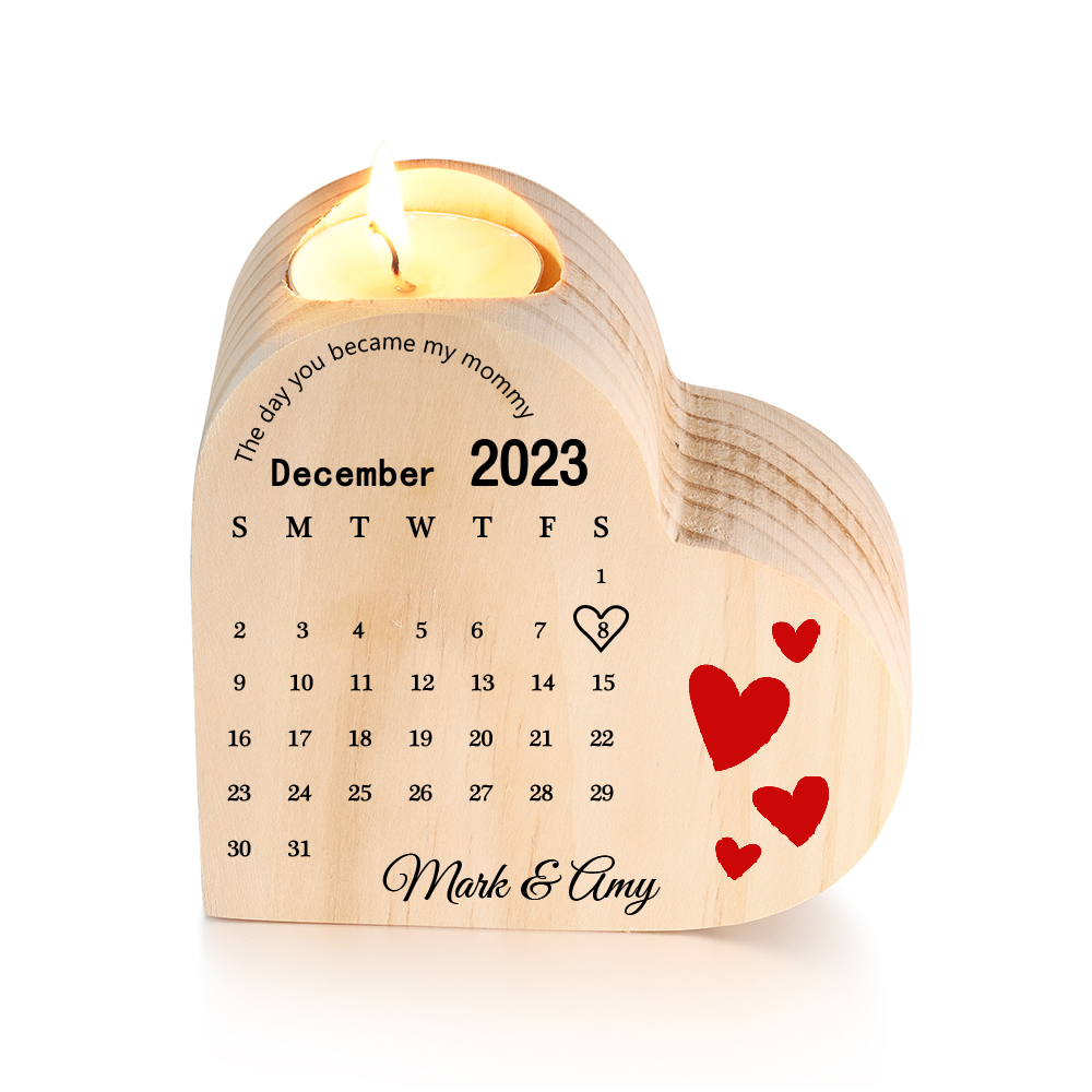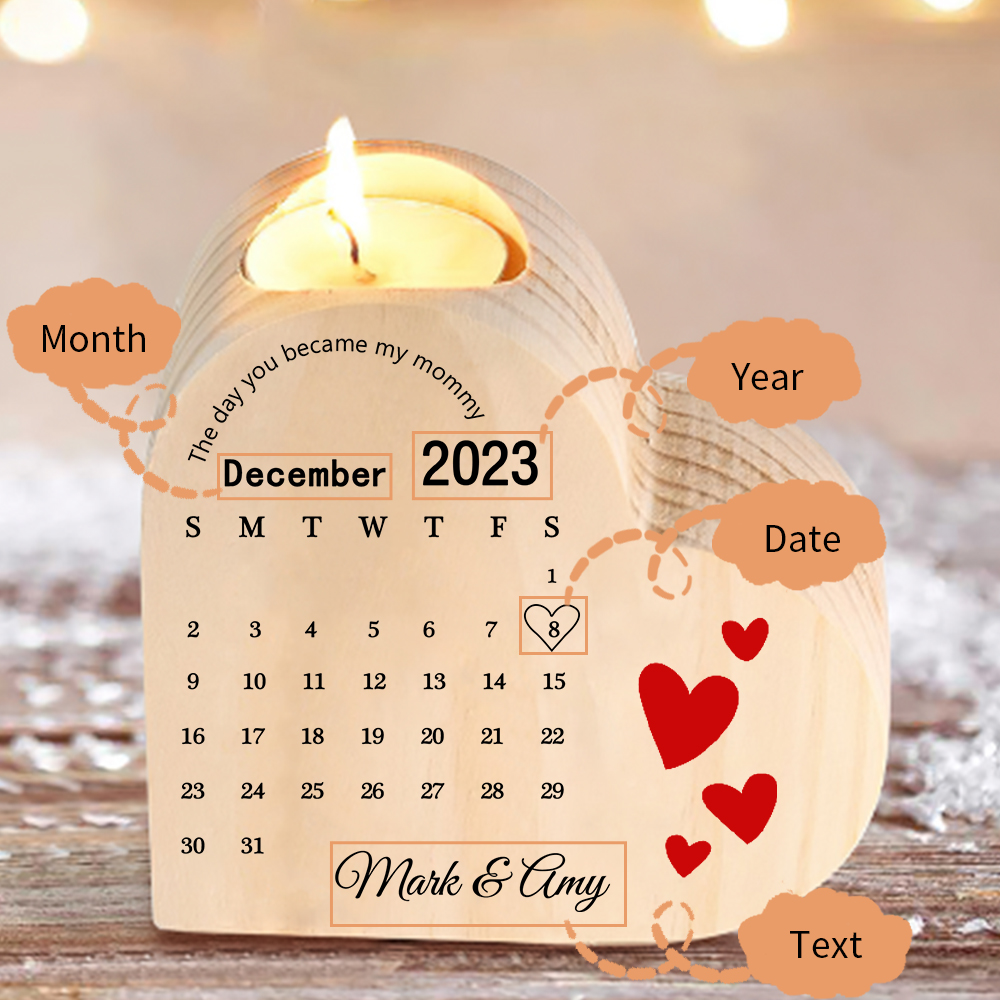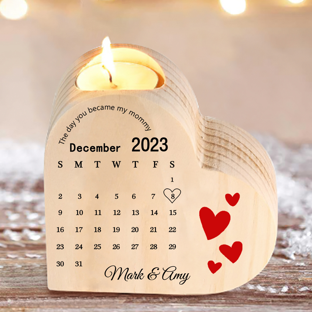 The Day You Beacame My Mommy Personalised Calendar Heart Candle Holder Wooden Candlestick